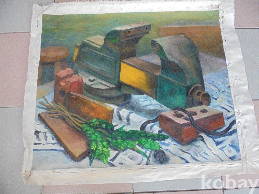 육중한 바에스 깨지고 안깨진벽돌 삼발둥근의자 채소등 다양하게 선명하게 실물처럼 잘그린 완벽한 정물유화