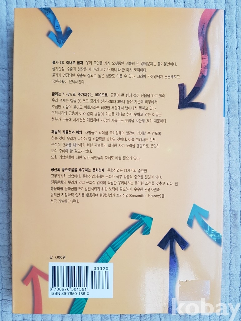 설명: 물가 3% 이내로 잡자. 금리는 7~8%로 주가지수는 1500으로, 재벌의 자율성과 책임, 정신의 중요로움을 추구하는 문화경제를 슬로건으로 하는 책이다.