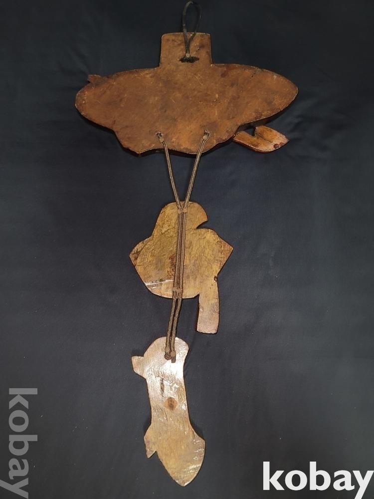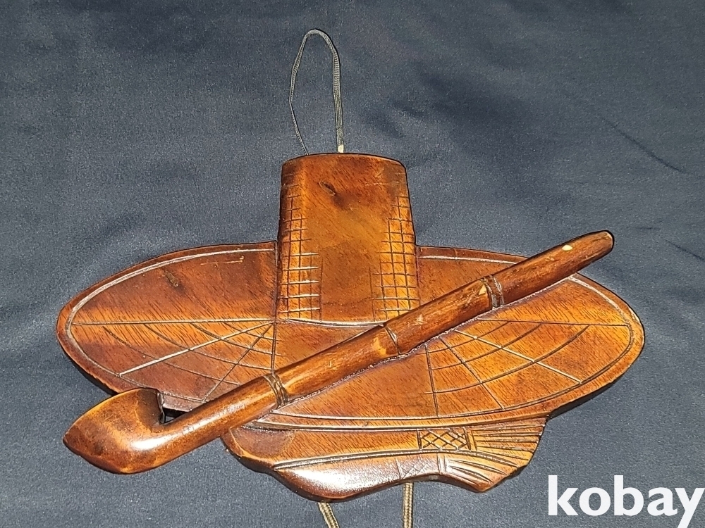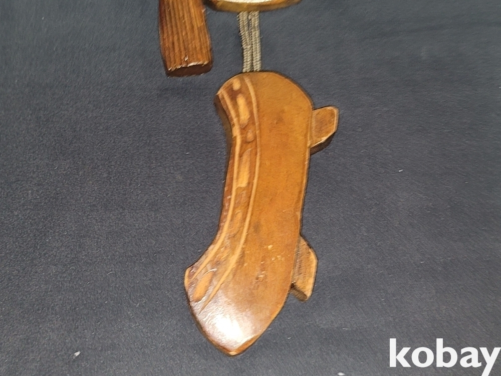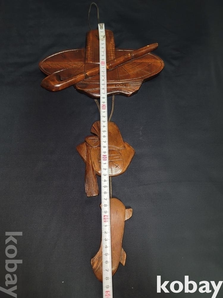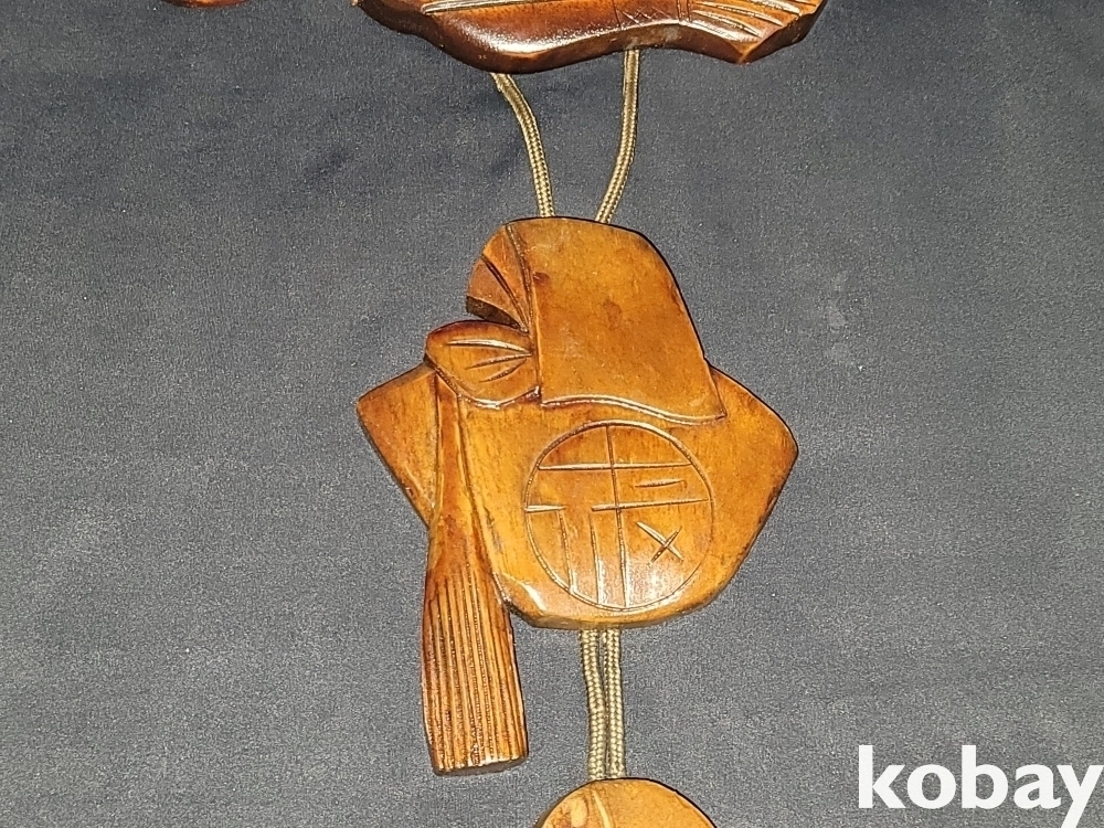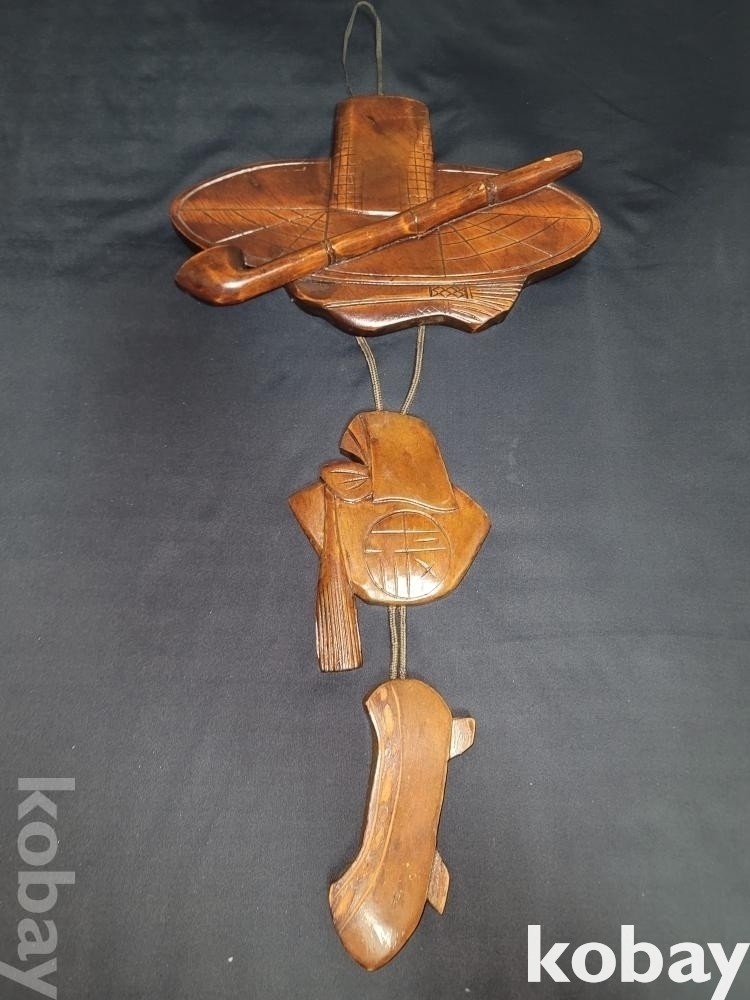 빈티지 세월 감이 느껴지는 삿갓, 곰방대, 복주머니, 나막신 모양 원목 조각 벽걸이 장식입니다.