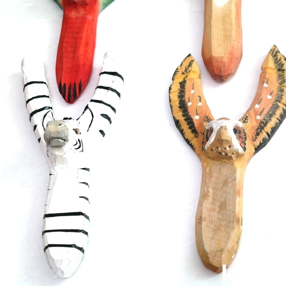 나무를 조각하여 만들어진 새총모양의 장식 8P 입니다.