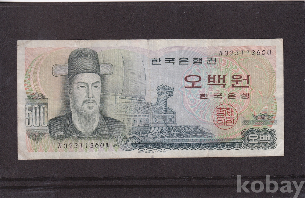 - 한국은행 1973년 이순신 오백원 32포인트 사용제 지폐