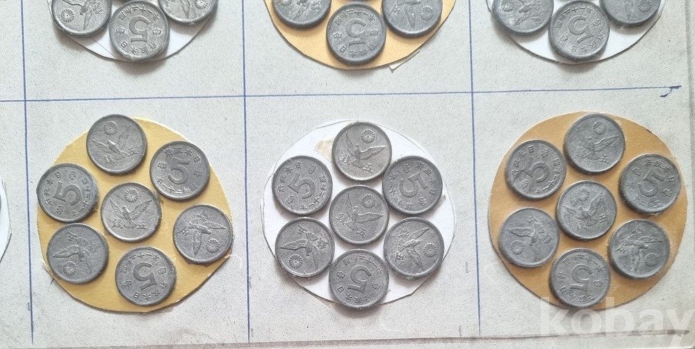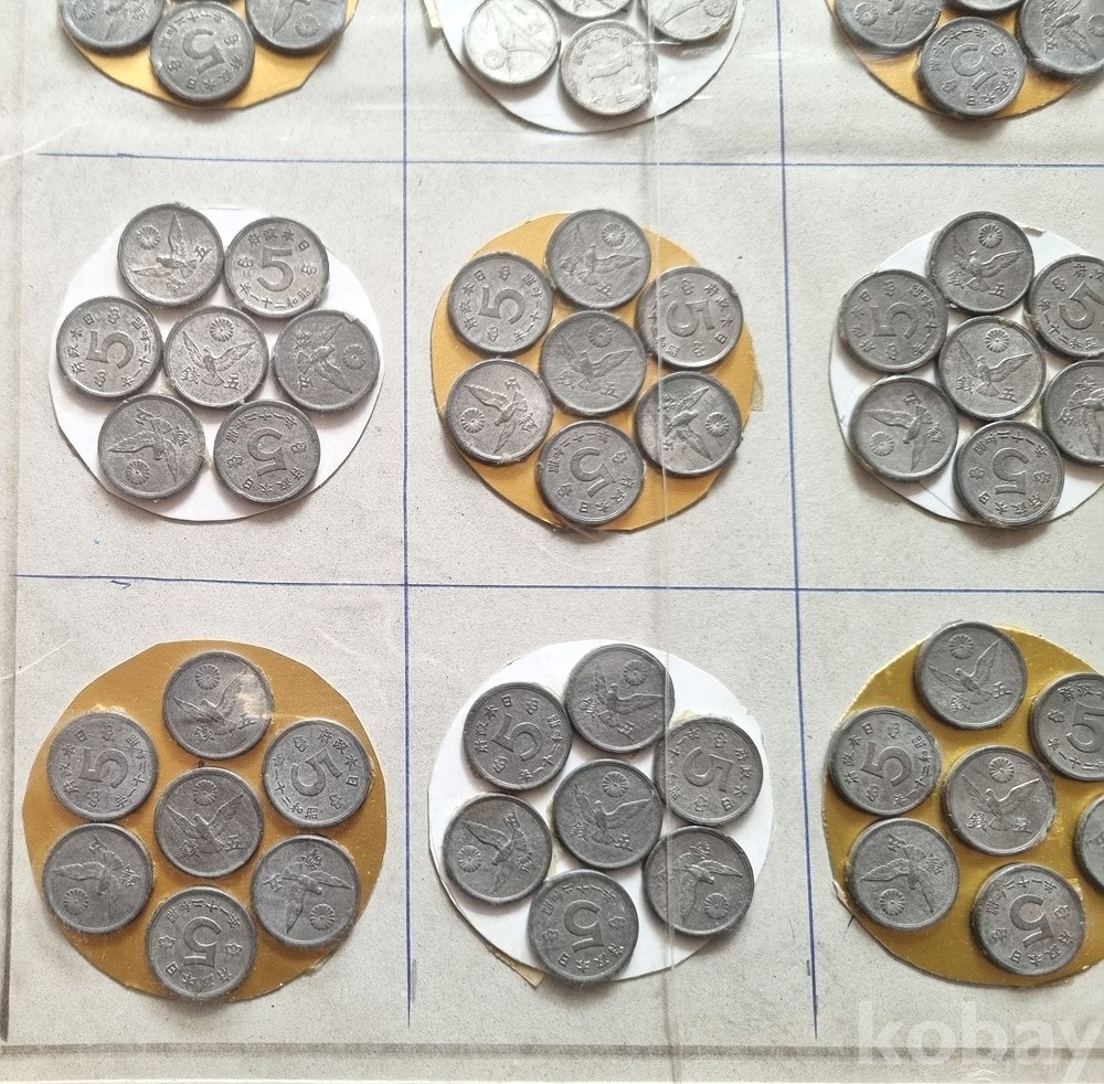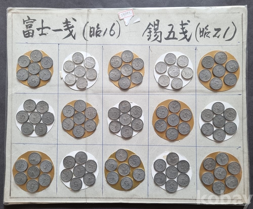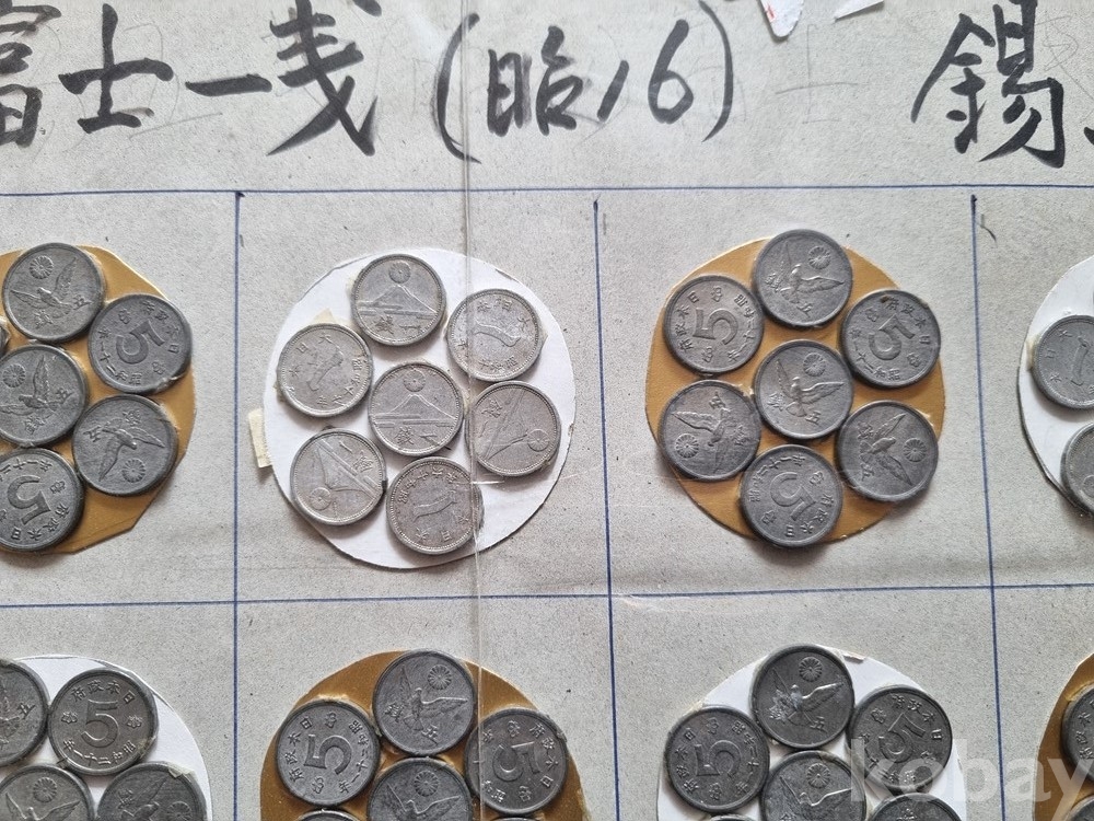 주화 종류: 1. 후지산 1센(富士一銭): 알루미늄 재질 (사진 상단 왼쪽 2번째 묶음 위주)2. 꿩 5센(錫五銭): 주석(Tin) 재질 (대부분의 구성품)