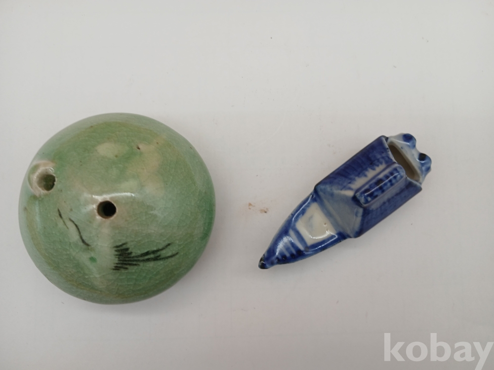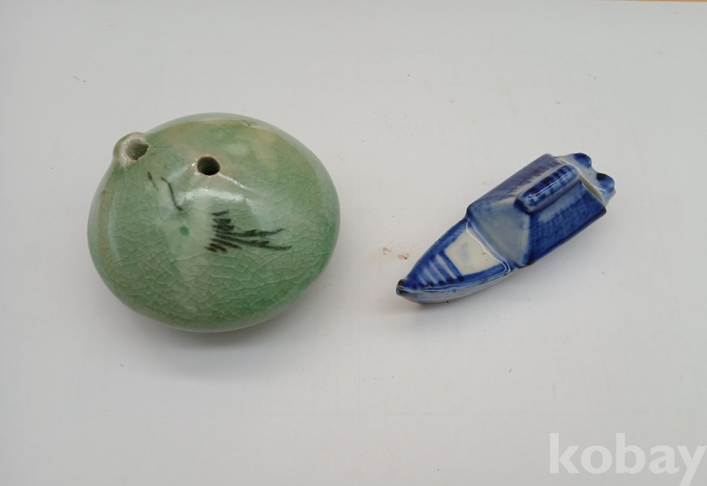 년대가 좀 있어 보이는 청자 연적과 청화백자 배모양 필세 입니다.