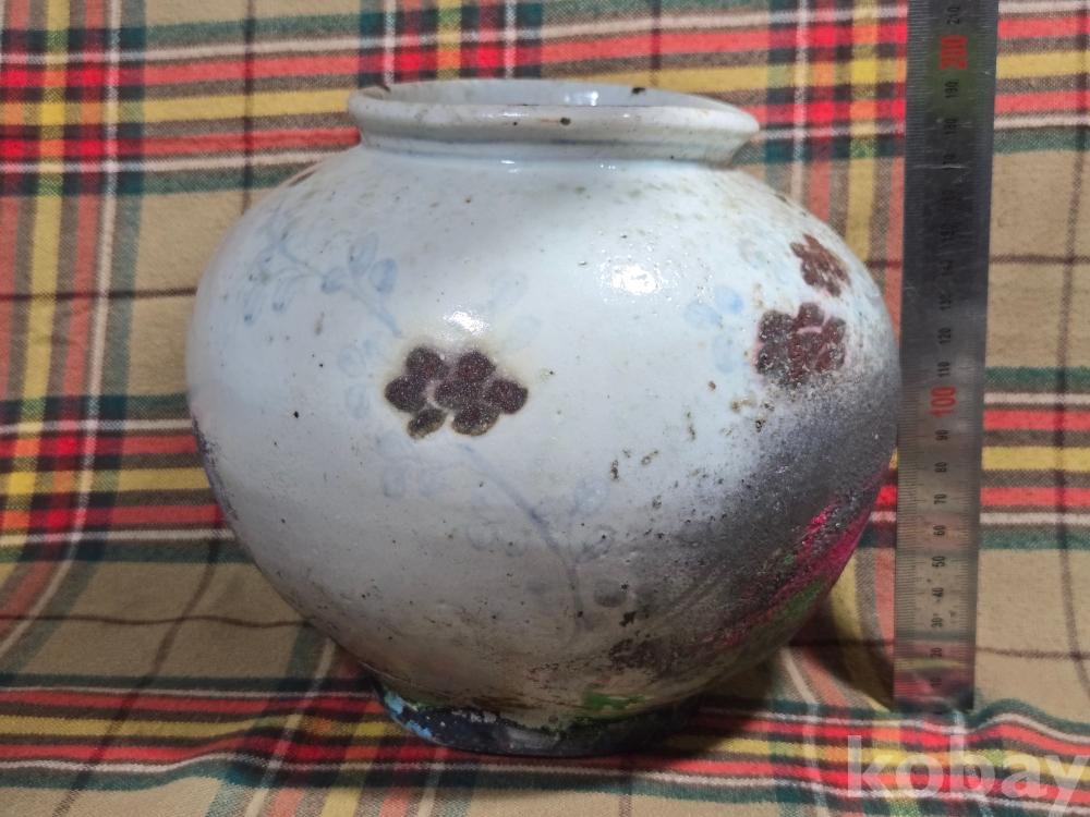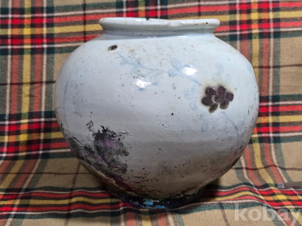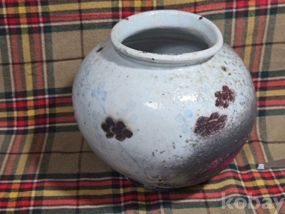 깊고 진한 발색의 진사안료로 표현된 아름다운 풀꽃에 나비가 날아드는 도안이 새겨진 조선후기 지방가마 백자 항아리 입니다.