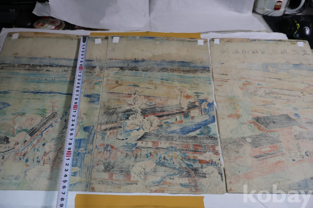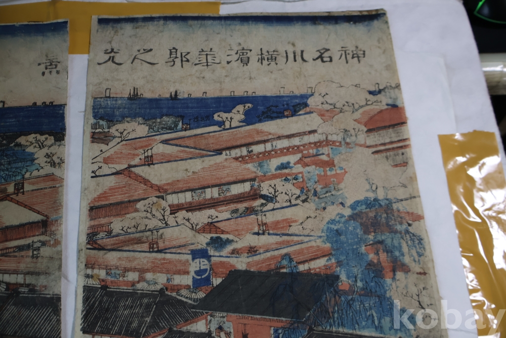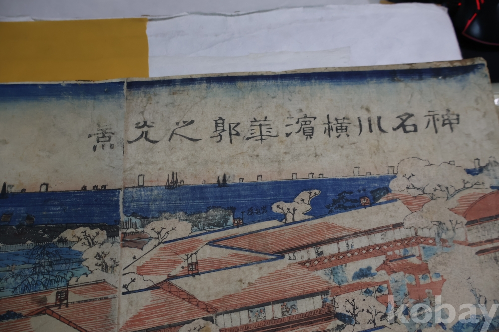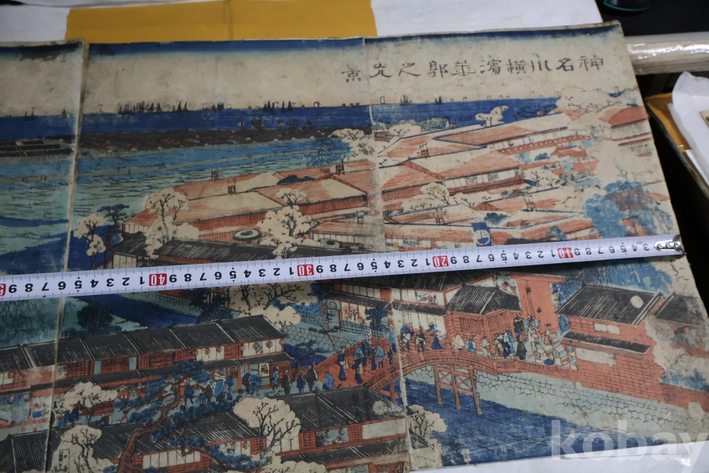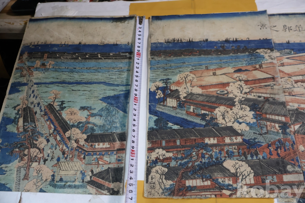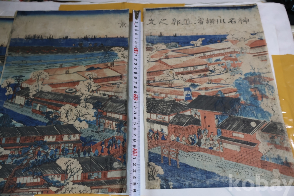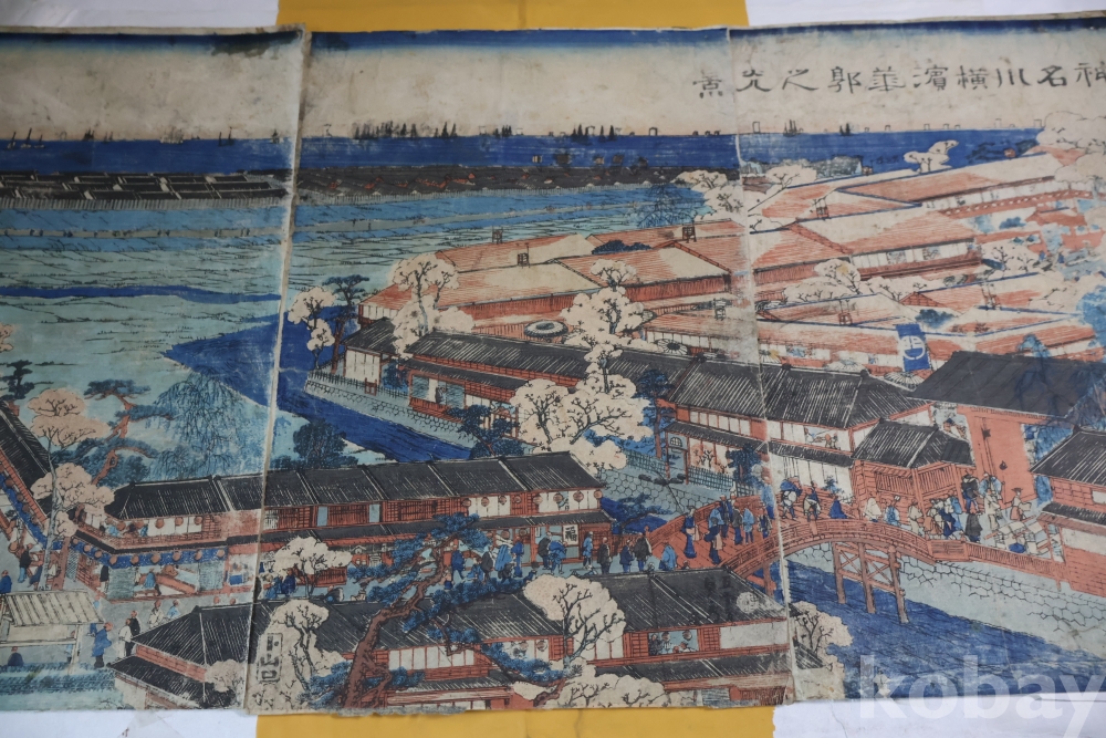 우키요에 목판화 원본 임니다 19세기 원본 이며 화가의 낙기가 없는 멋진 디자인 정교한 그림 고테미를 가진 명화 임니다 요코하마의 원경 임니다