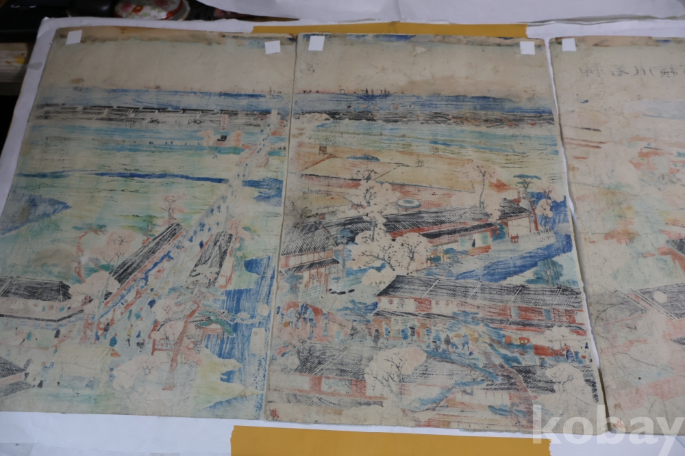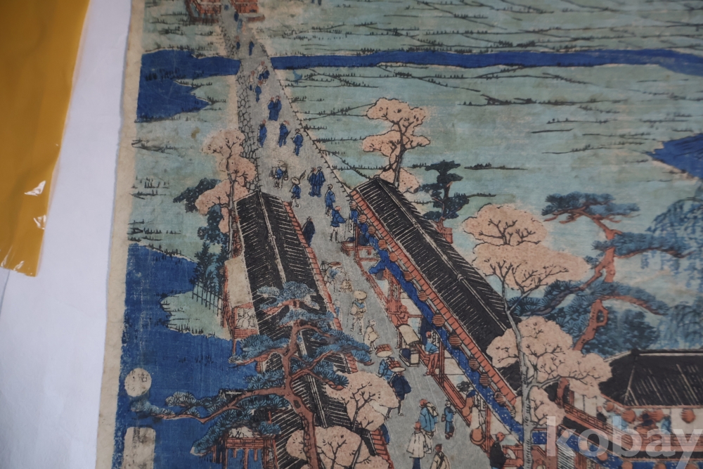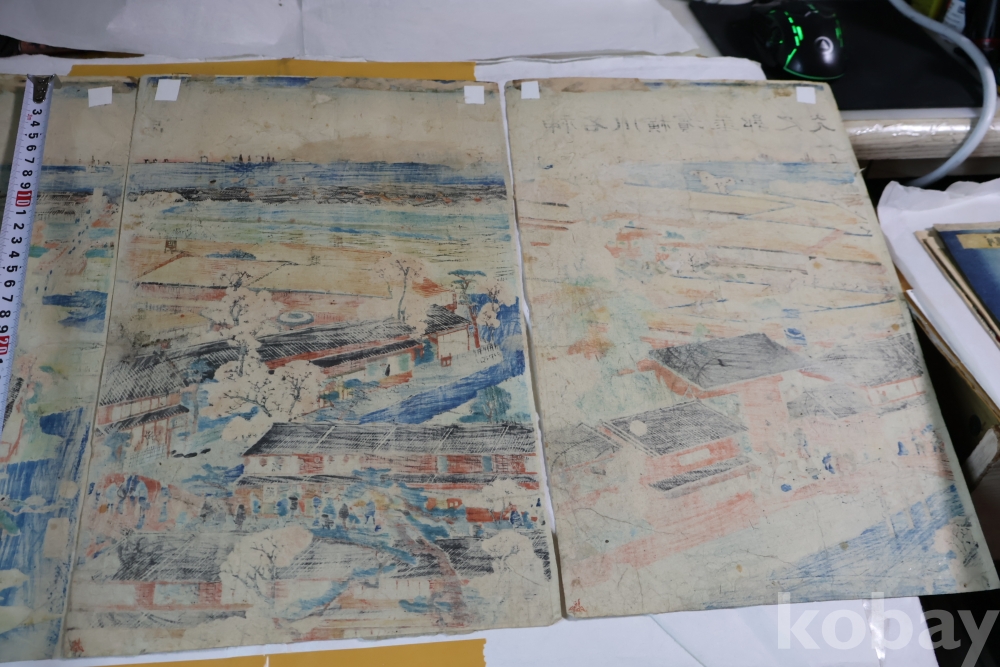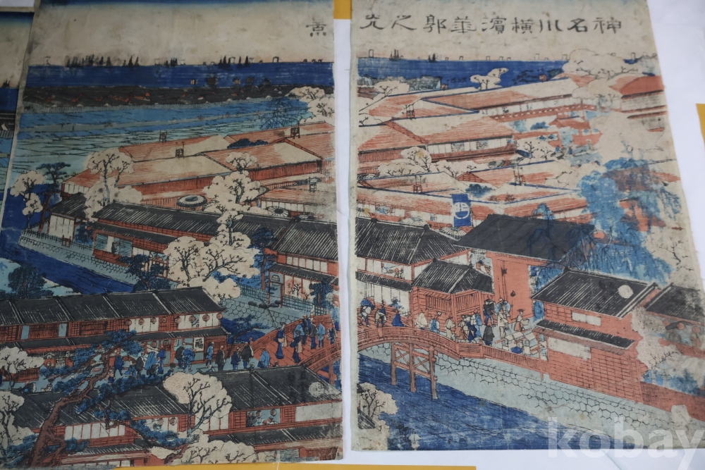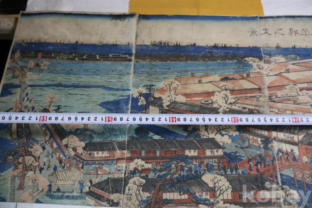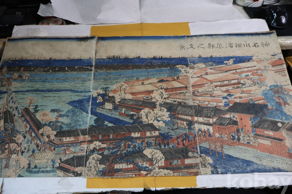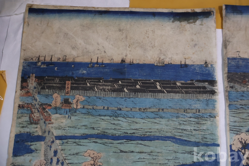 우키요에 목판화 원본 임니다 19세기 원본 이며 화가의 낙기가 없는 멋진 디자인 정교한 그림 고테미를 가진 명화 임니다 요코하마의 원경 임니다