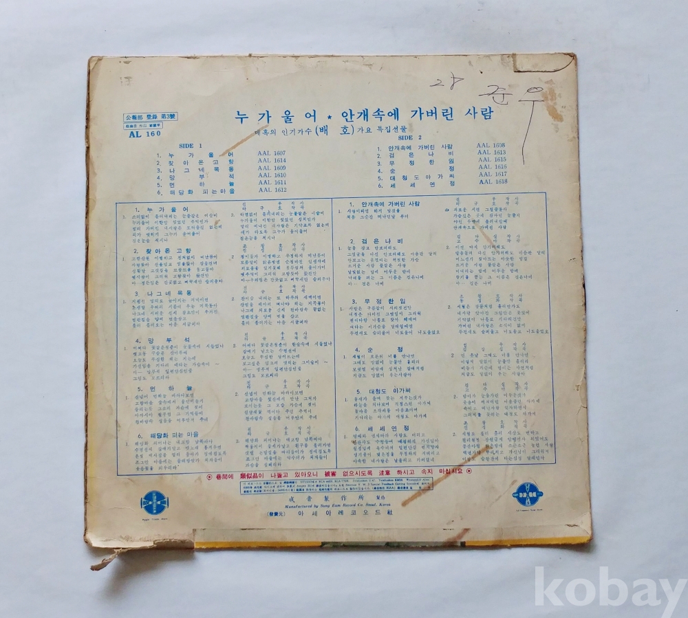 | 자켓상태 | EX : 약간의 마모, 모서리 찢김 존재 | 음반상태 | EX : 재생에 영향 없는 가벼운 기스 존재 | 발매정보 | 알수없음 | 가사지여부 | 무 |