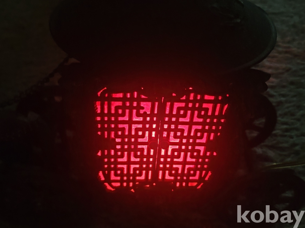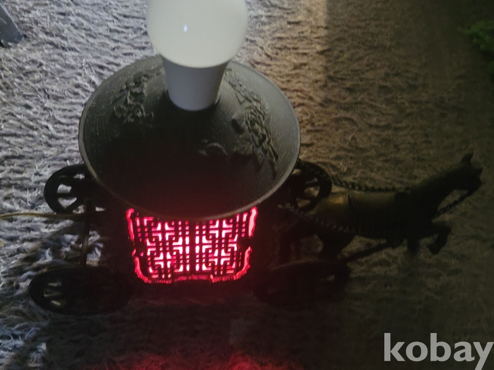 마차에 은은한 붉은빛 조명과 위쪽에 있는 전구 등 두 가지 중 선택하여 바꿀 수 있습니다.