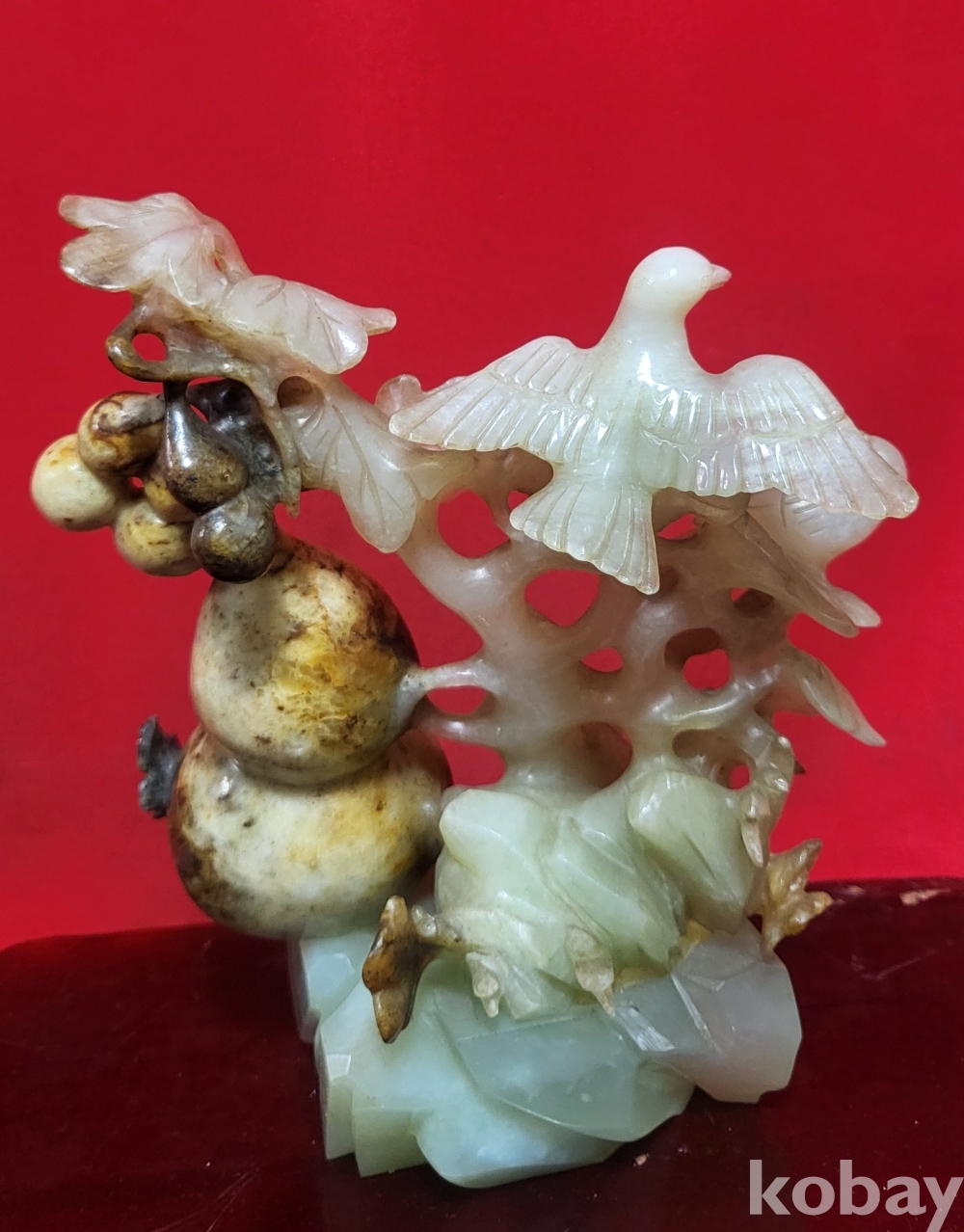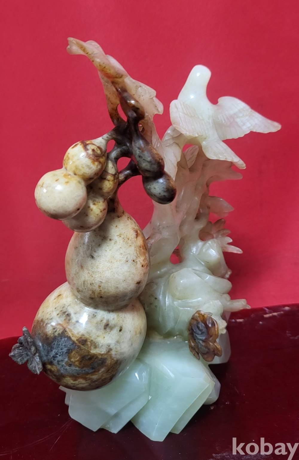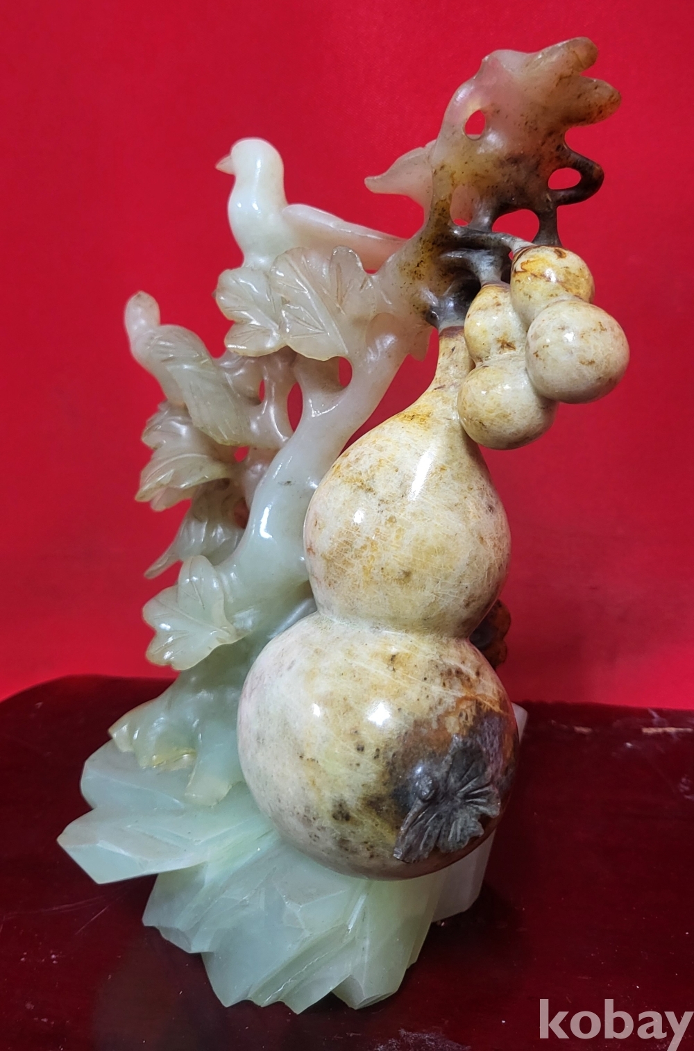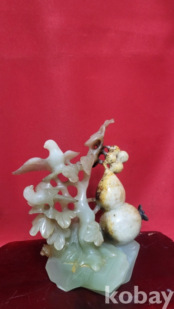 천연 고옥(古玉)으로 완성된 조롱박과 나무에 앉아있는 새(鳥) 문양 조각품입니다,