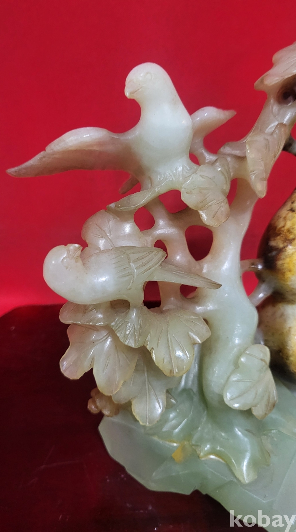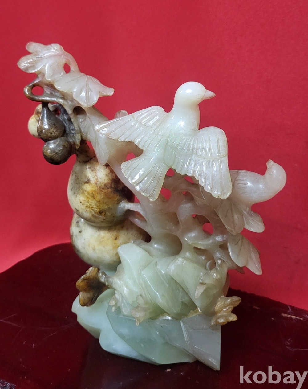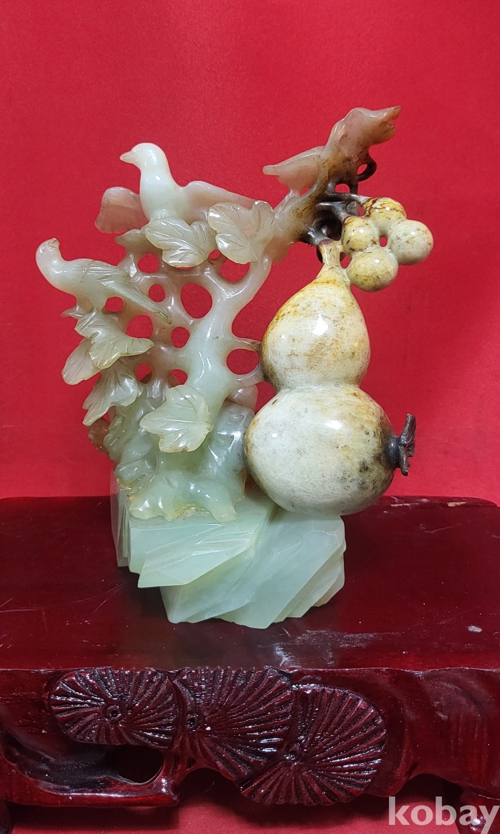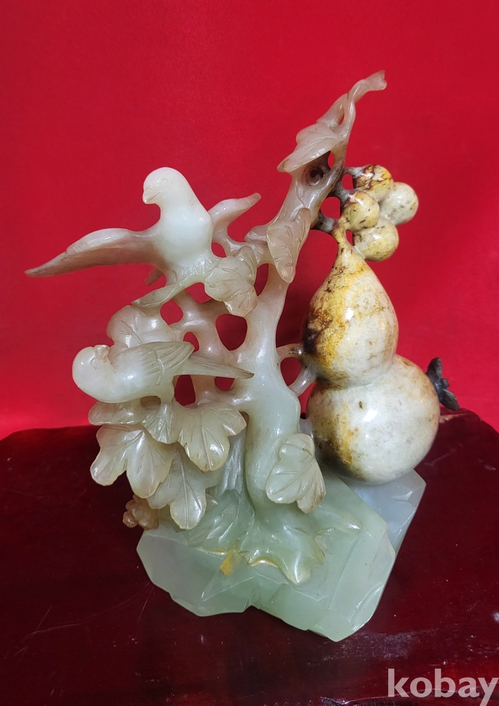 천연 고옥(古玉)으로 완성된 조롱박과 나무에 앉아있는 새(鳥) 문양 조각품입니다,