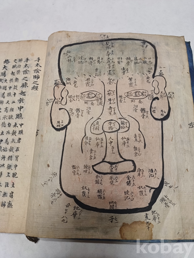 상태 a급 의서 사람 얼굴에 부위 내용과 숫자를 수록 하고 좌.우 를기록 침술에 대한 의서 인가 봅니다