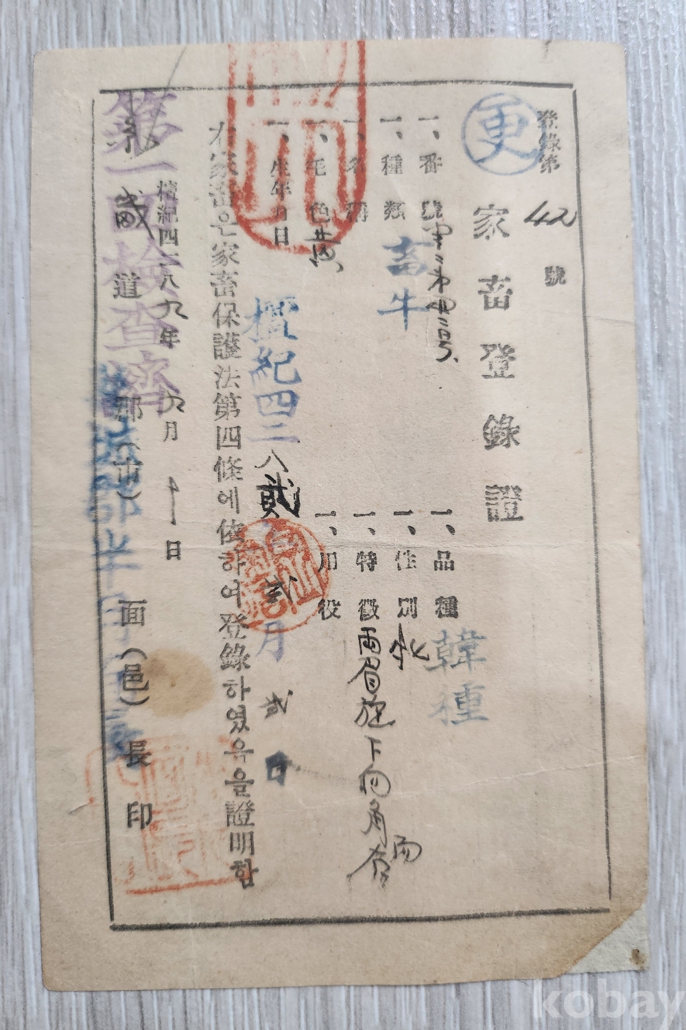 단기4289년 1956년 가축(송아지) 등륵증 입니다 특이한 등록증서 입니다