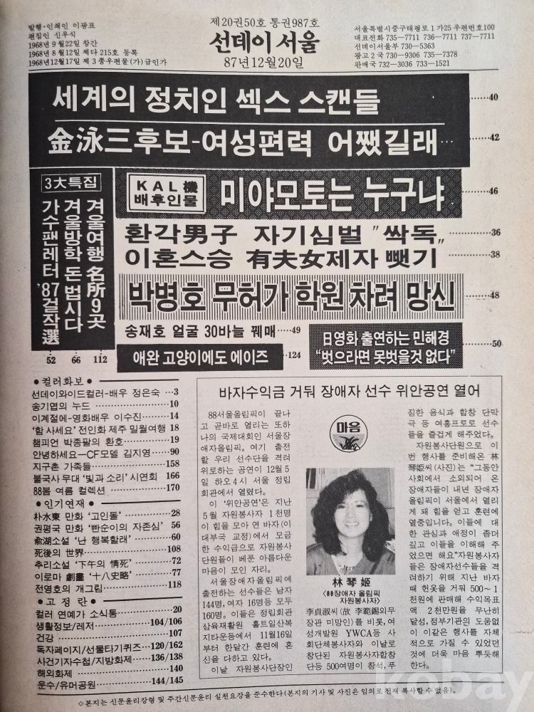 [희귀 근대사 자료] [선데이 서울] / 1987.12.20일 / 표지 탤런트 최수지