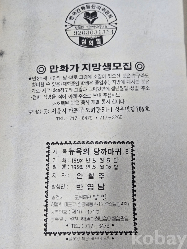 80-90년대 추억의 만화방 = 청소년 만화 = 안철주 글.그림 = 뉴옥의 당까마귀 8권 완질