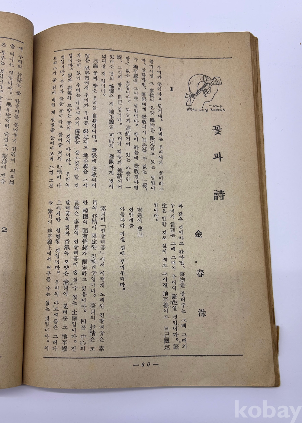 설 명 | 1957년 정음사에서 발행 유치환이 편집한 문예잡지 [현대시(現代詩)] 창간호 1책이다. 장정은 전봉건이 맡았다. 유치환, 김현승, 신동집, 조병화, 정한모, 김춘수 등의 글이 실려있다. 책등 상태 험하고 표지 및 본문 찢김과 부식 등 사진으로 상태 확인 필요하다. | |||||