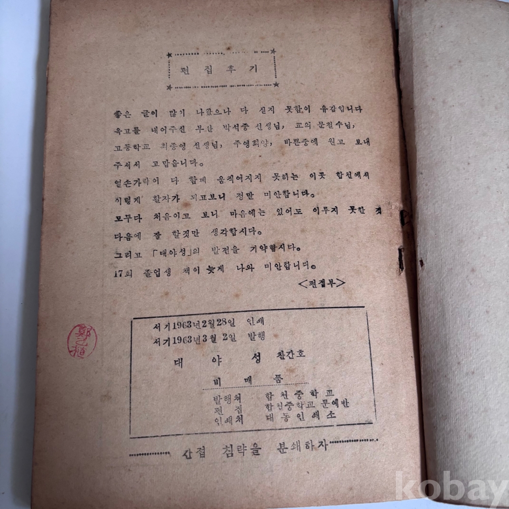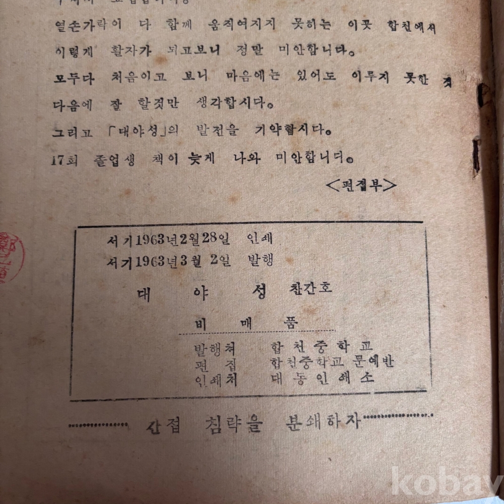 1963년 합천중학교 학예지 창간호 대야성 입니다.