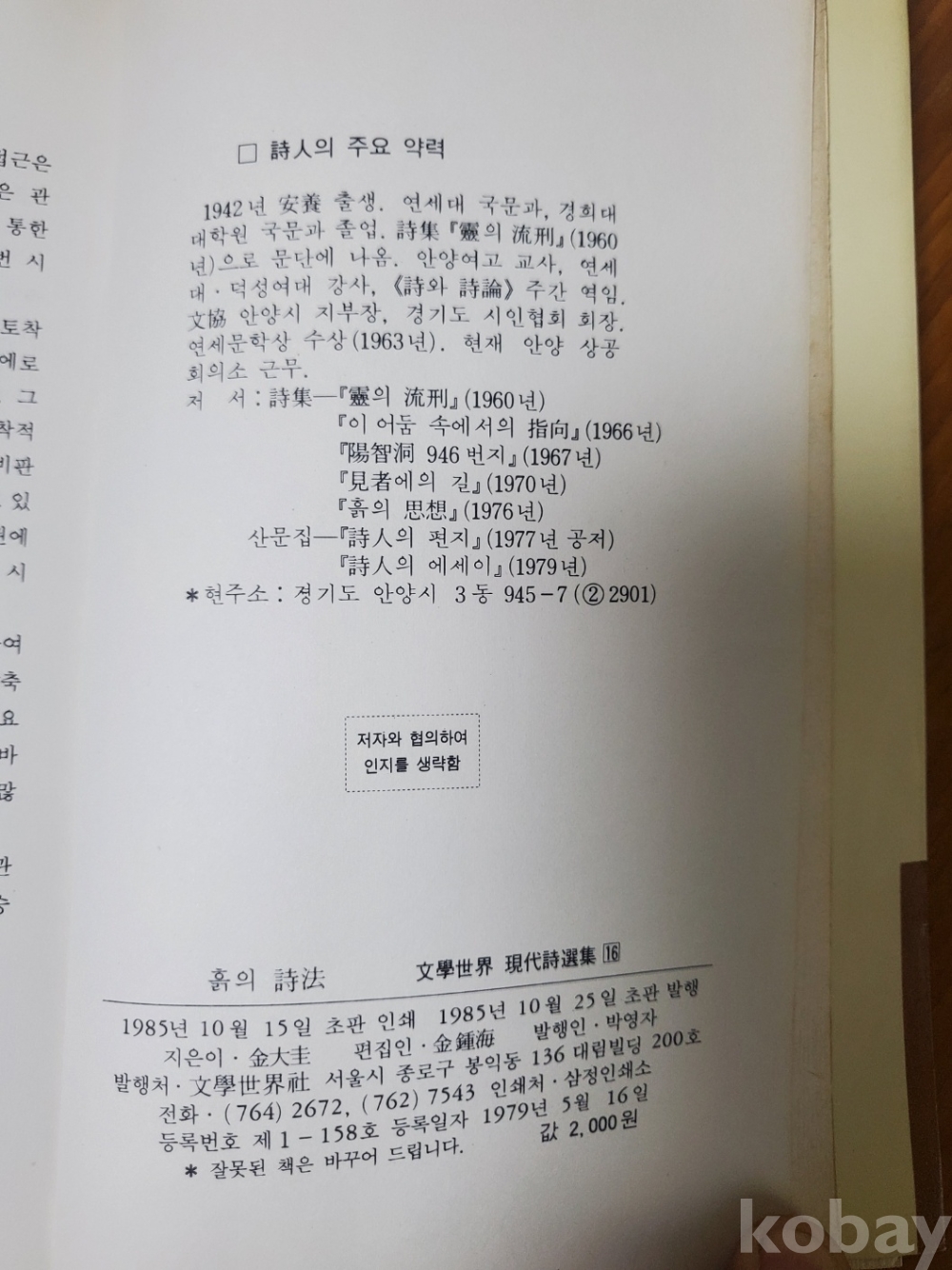 1. 흙의 시법, 김대규, 문학사상사, 1983년, 120쪽, 상태 상, 사진 참조