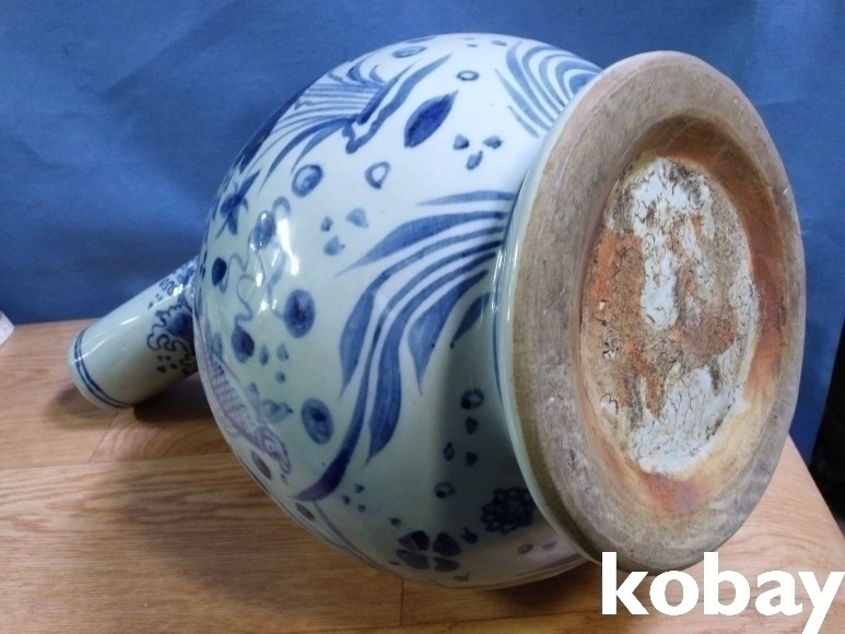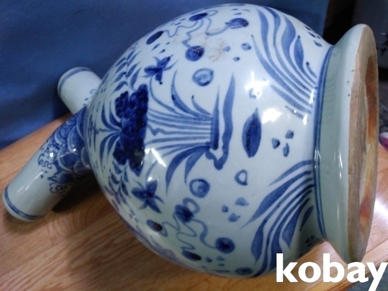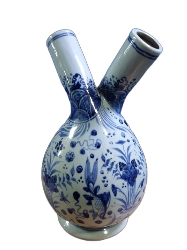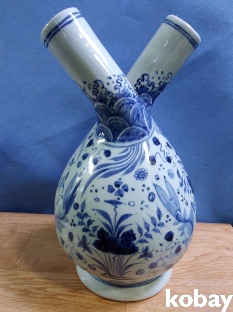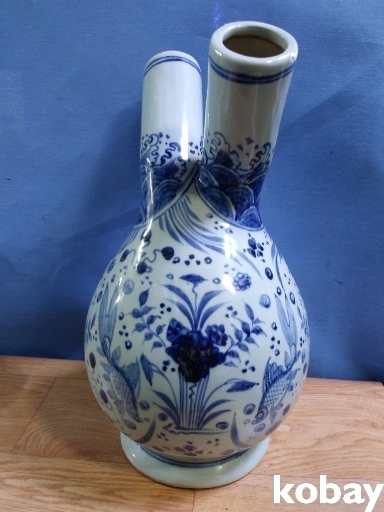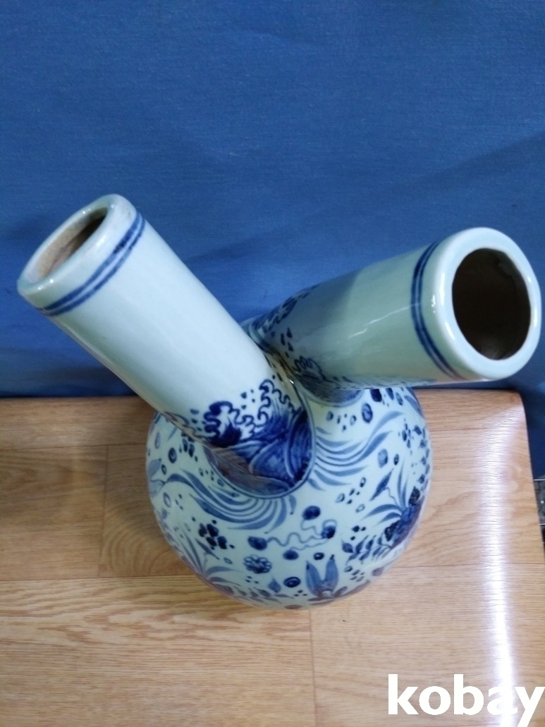청화의 색감의 좋은 입이 두개인 도자기 입니다.