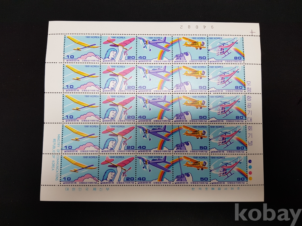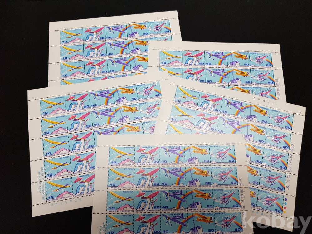 - 미사용 1981년 모형항공기대회 기념우표 전지 5장 일괄