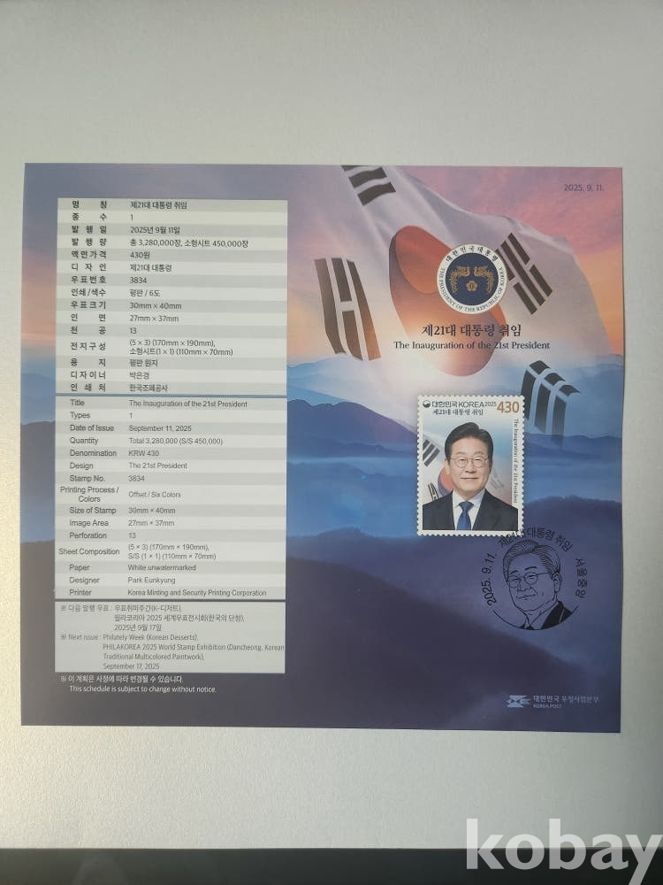 2025년 제21대 대통령(이재명) 취임 기념우표첩 + 안내카드