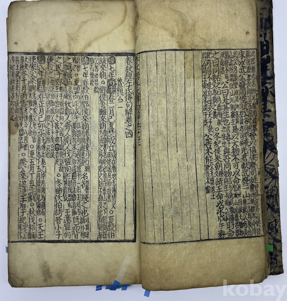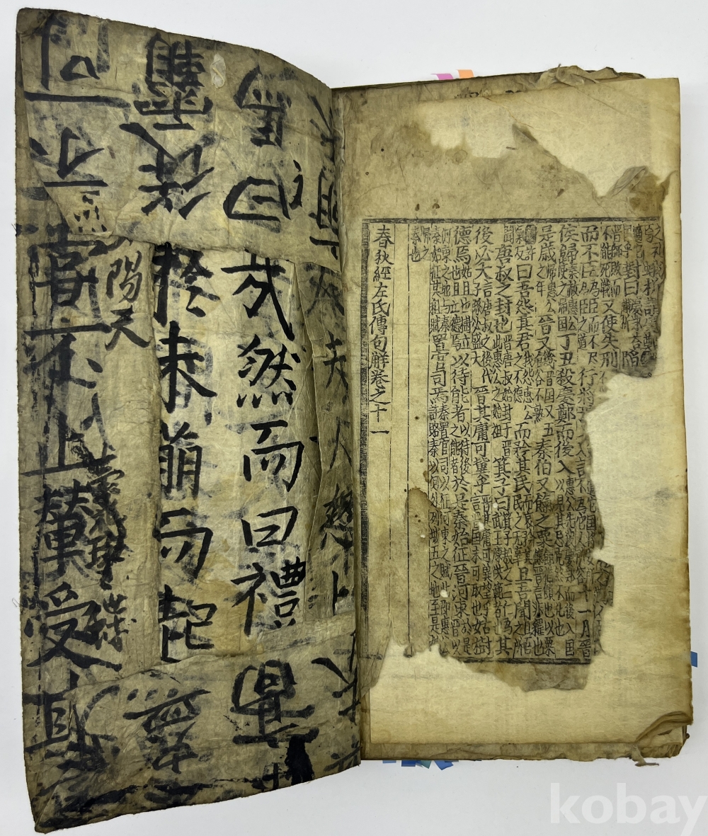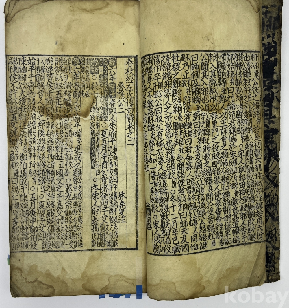 설 명 | 노의 좌구명이 저술한 “춘추좌씨전(春秋左氏傳)”을 풀이한 주석서이다. 권1 권두부터 5장 여 낙장으로 보인다. 권2 뒷부분과 3권 앞부분이 낙장이다. 권말 2장 찢어져 본문이 훼손된 부분이 있으며, 1장 구김과 찢김이 있다. 물품번호 7 | |||||