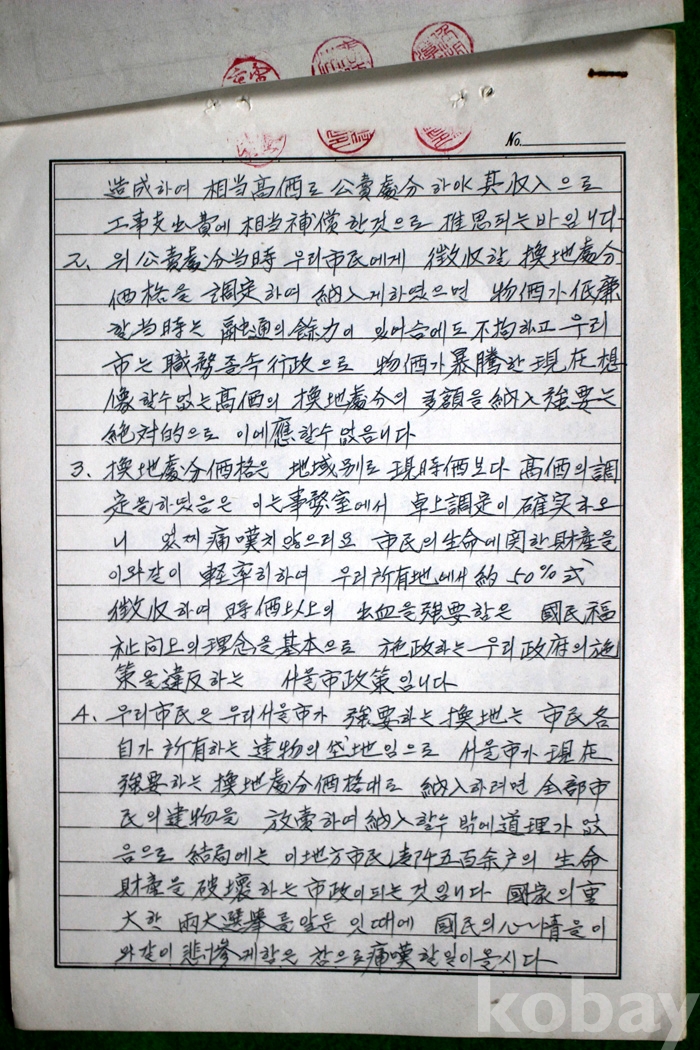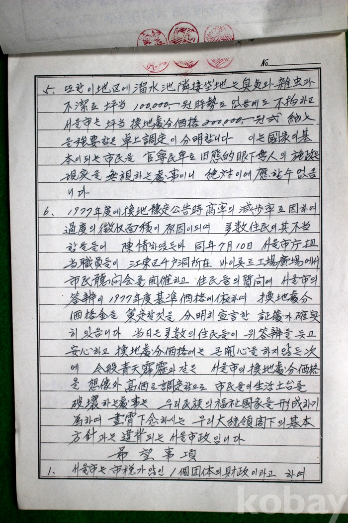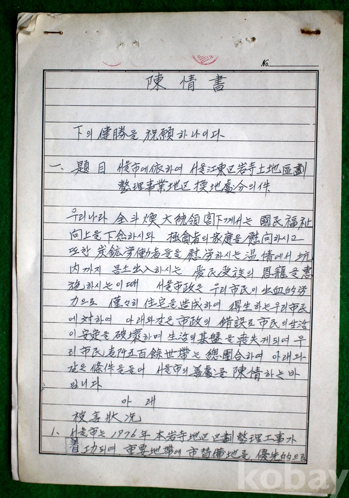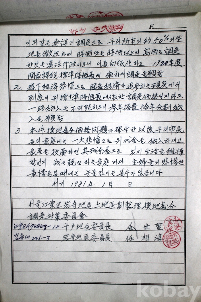 1981년 서울시 암사토지구획에 따른 사업지구 환지처분에 관한 진정서 1부 (친필)