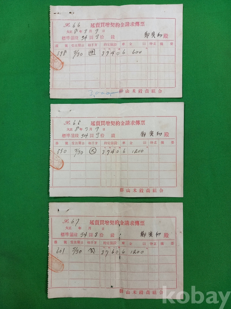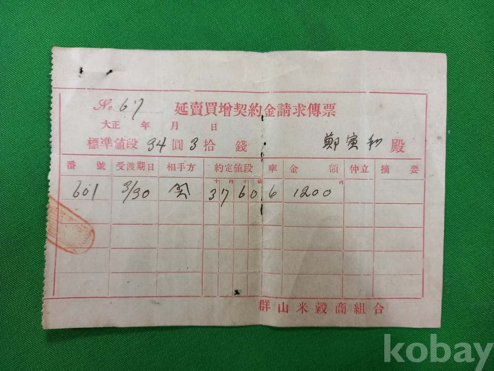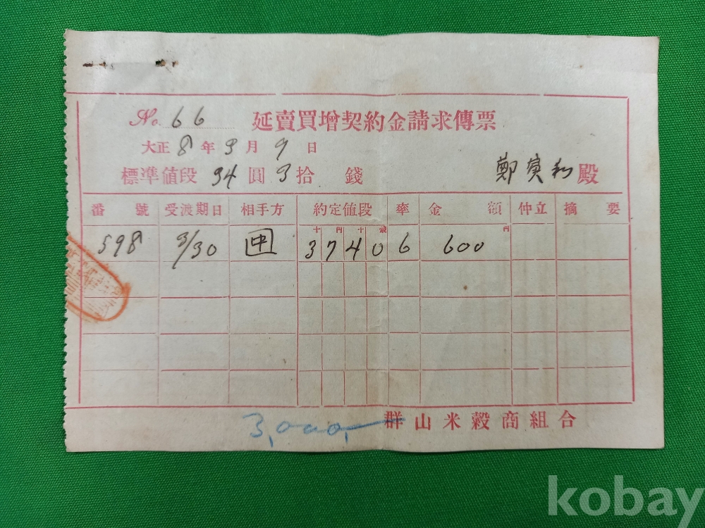 일제강점기 당시 군산미곡상조합(群山米穀商組合)에서 발행한 연매매계약금청구전표(延賣買契約金請求傳票)로 당시 곡물 거래 과정에서 발생한 계약금을 청구하기 위해 작성된 것이며 군산은 일제강점기 당시 호남 평야의 쌀이 집결되어 일본으로 수거되던 주요 항구 도시였습니다. 일제강점기 초기 군산을 중심으로 이루어진 미곡 수탈 및 유통 체계를 보여주는 상업 사료로서 가치가 있습니다.