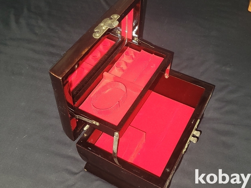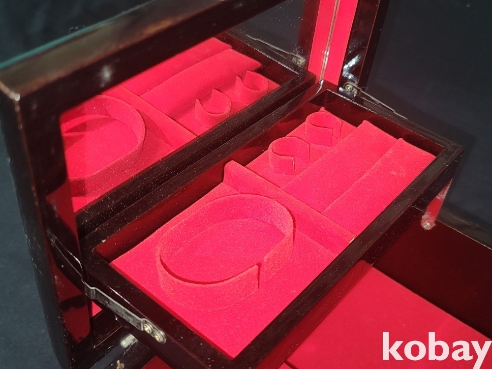 태엽을 감고 뚜껑을 열면 노래가 흘러나오고 안쪽은 거울이 있고 화장품, 장신구 등을 담을 수 있습니다.