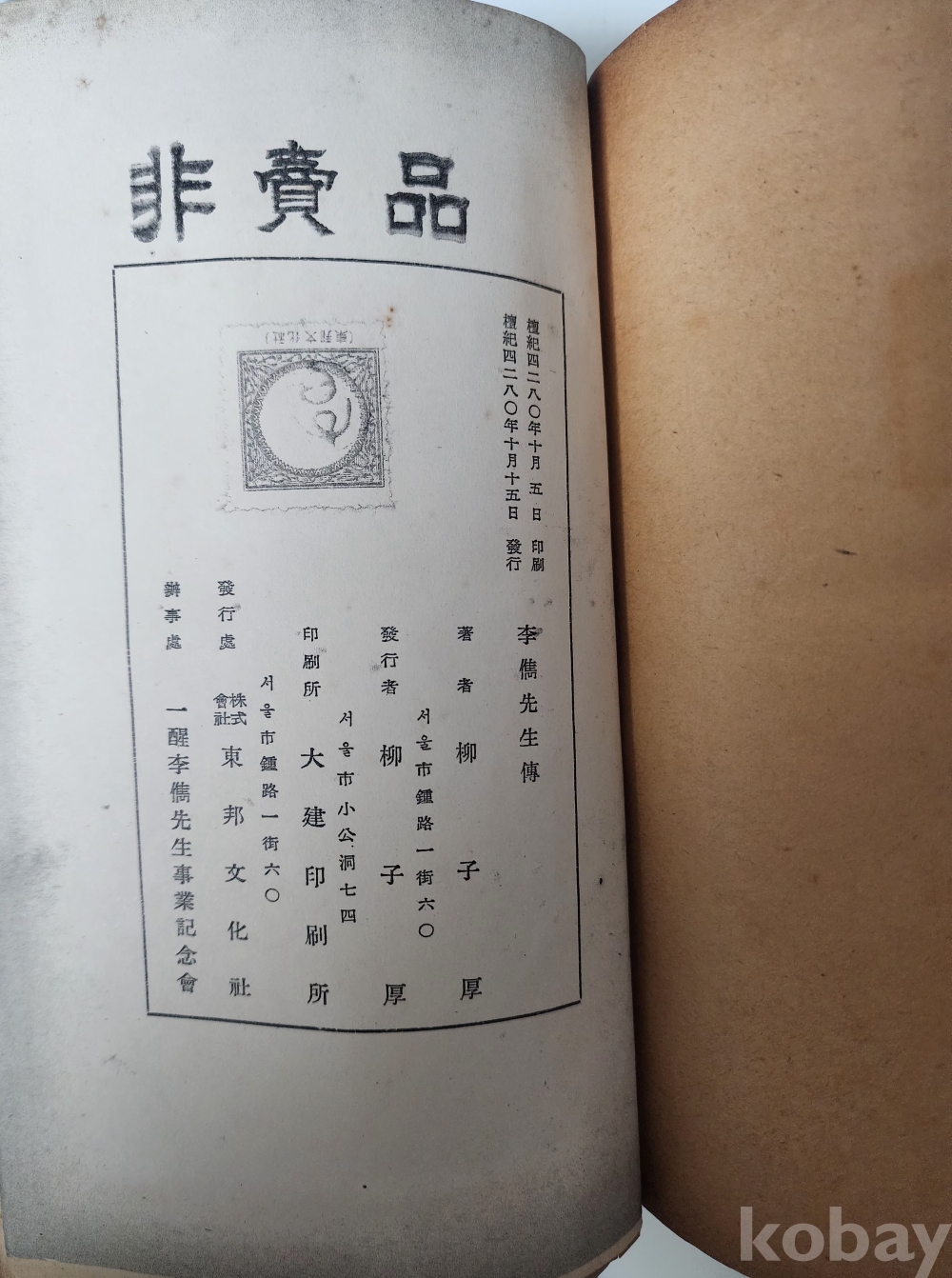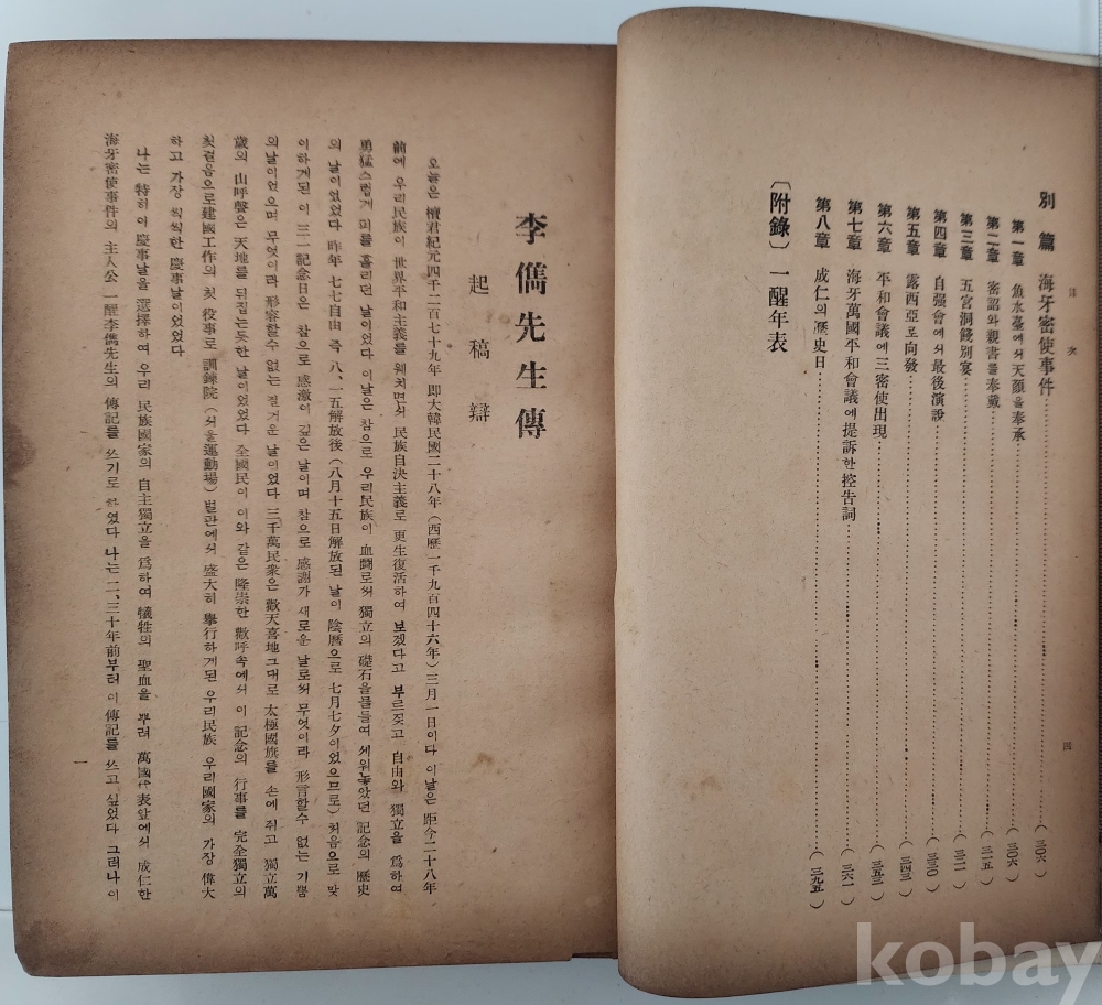 자료명/ 저자/ 발행/ 형태사항 | 『이준선생전 · 李儁先生傳』/ 유자후(柳子厚, 1895~?) 著/ 서울: 東邦文化社, 檀紀4280[1947].10.15_초판본/ 4, 419p., 도판[9]p. 판권지 복사, 책등·뒤표지 개장. |