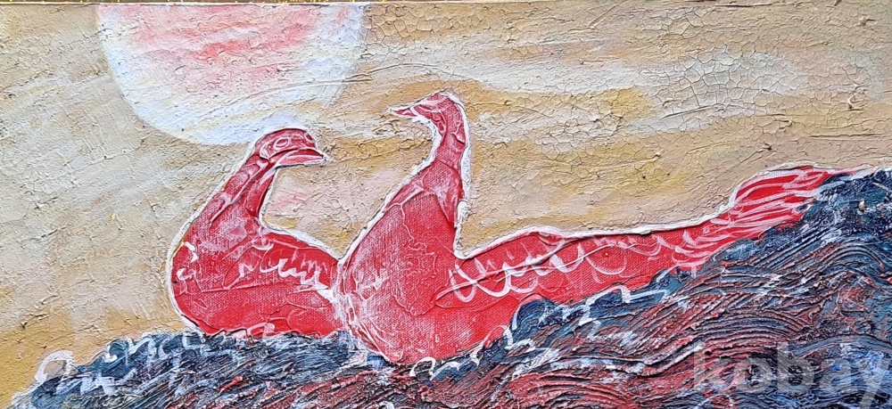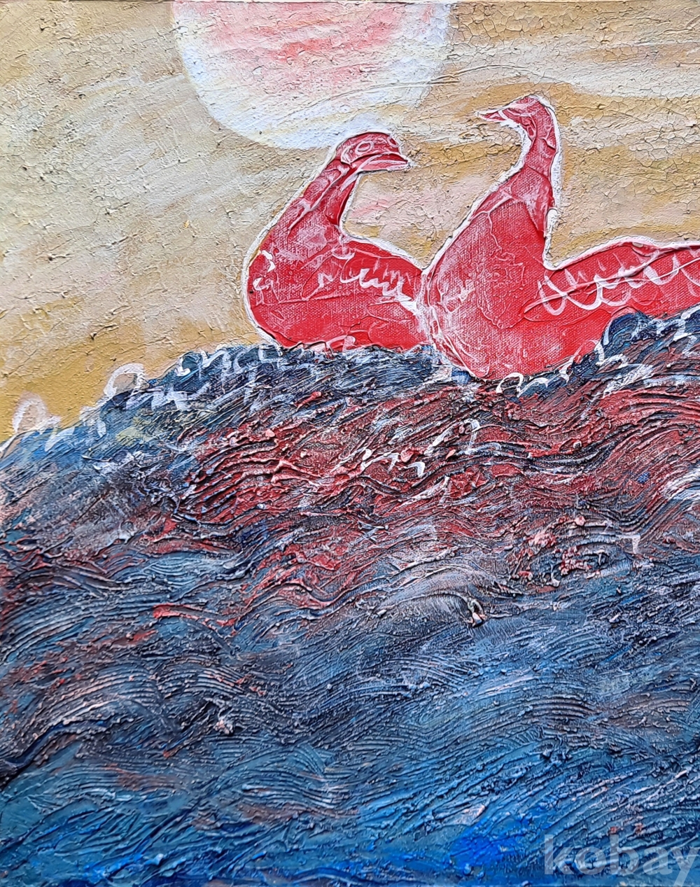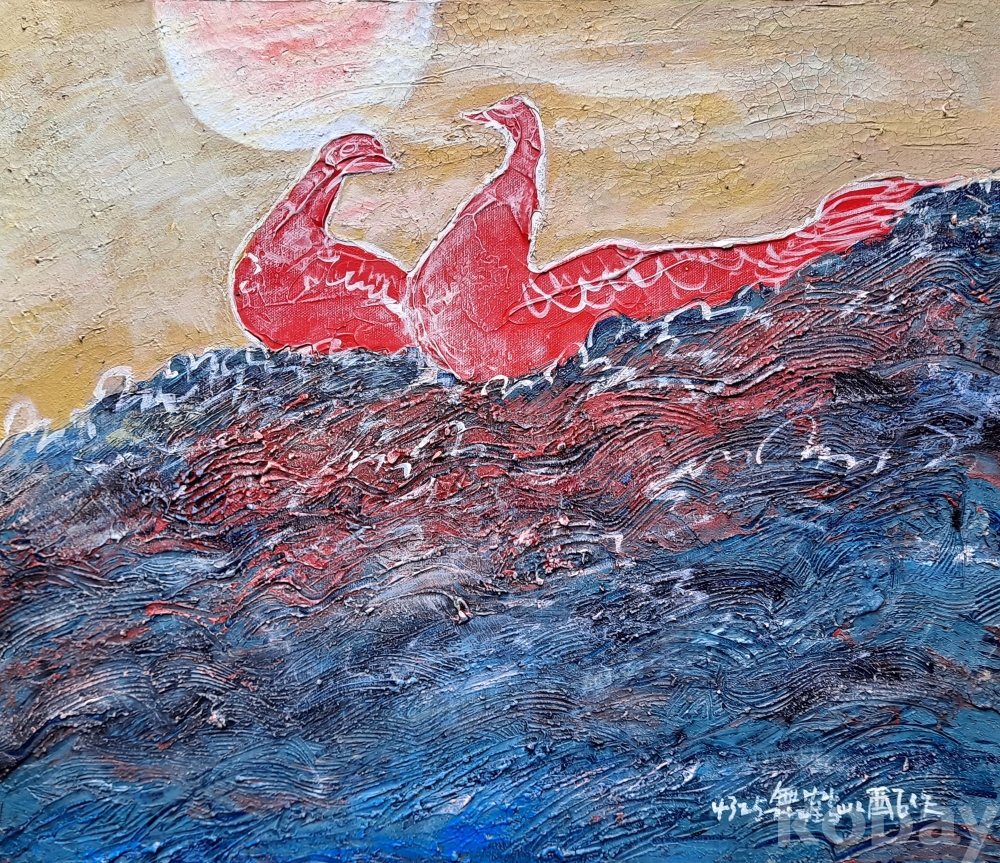 작품을 직접보시면 파도치는 물결위의 붉은새 두마리를 입체감있게 그리셨는데 파도 표현이 너무 리얼해서 역시 대가다운 면모를 유감없이 보여줍니다