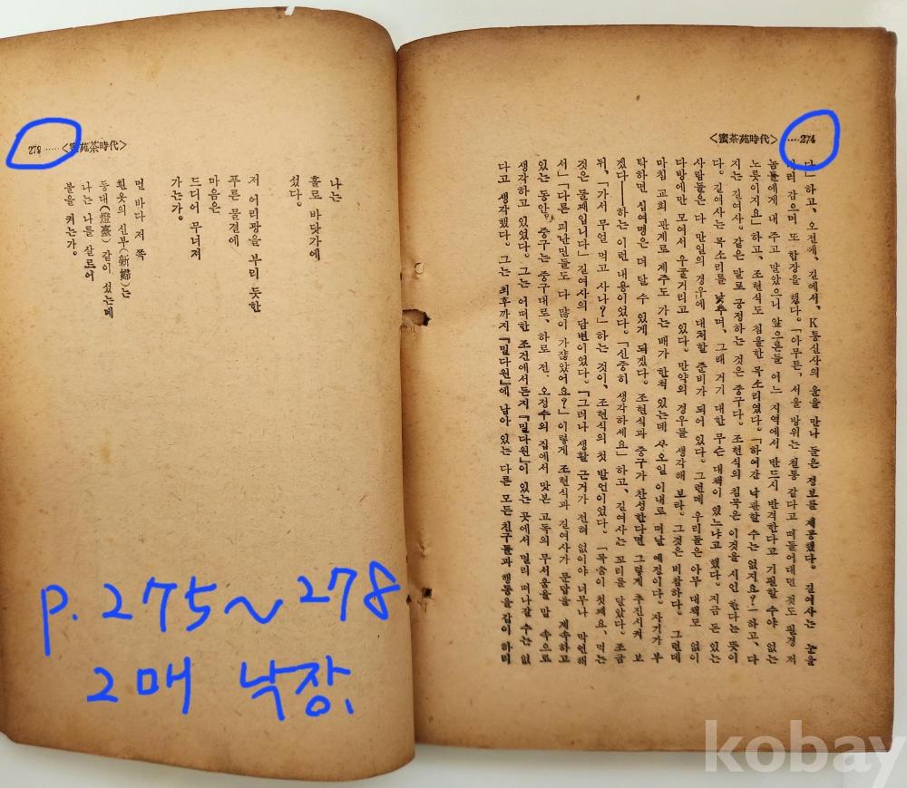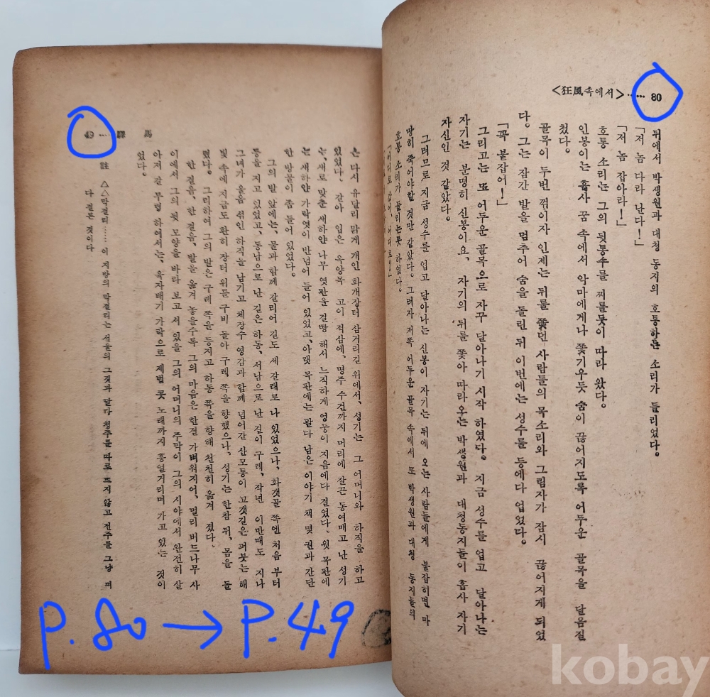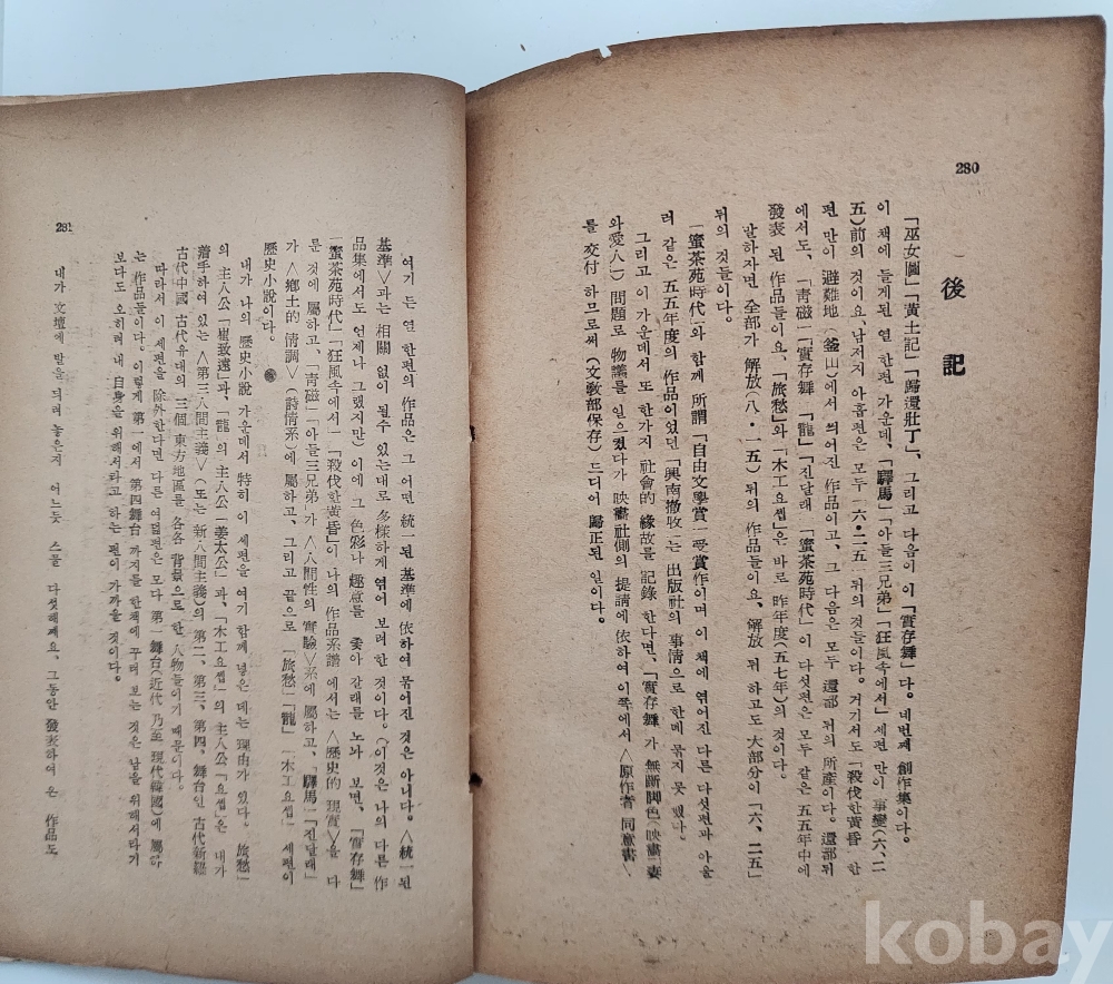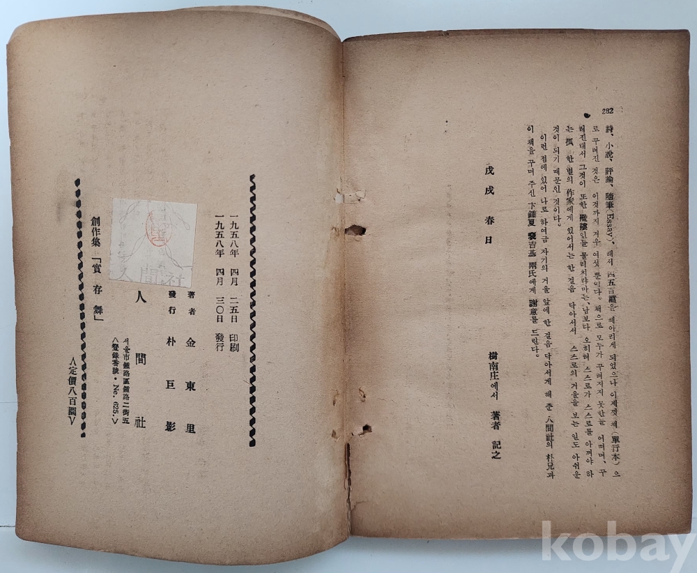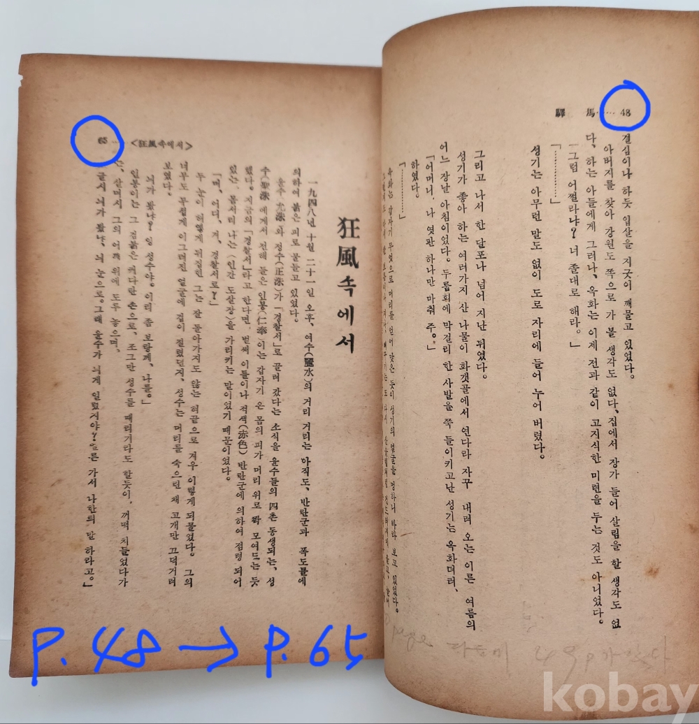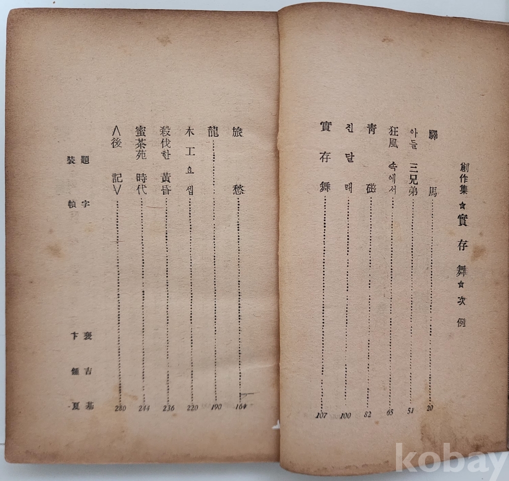 자료명/ 저자/ 발행/ 형태사항 | 『實存舞: 金東里 小說集』, 김동리(金東里, 1913~1995) 著, 서울: 人間社, 1958.4.30_초판본, 282p., 대체적으로 낡았으며 48p 다음장이 65p로 연결되며, 80p 다음으로 49p(~64p)가 연결되는 제본 이상이 있음. 275p~278p(2매) 낙장. |