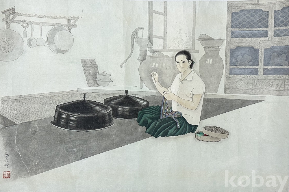 실내 주방 풍경을 배경으로 한 여인상을 담아낸 채색 작품입니다. 넓게 비워 둔 여백과 차분한 회색 톤의 바탕 위에 인물의 표정과 손동작을 또렷하게 살리고, 치마의 녹색 계열 색면과 소품의 질감 대비로 시선을 자연스럽게 모아주는 구성이 특징입니다. 화면 좌측에는 조리 도구가 걸려 있고, 중앙에는 항아리와 펌프 형태의 생활 도구가 배치되어 있어 생활감 있는 공간의 공기를 만들어 주며, 우측에는 수납장과 창문 프레임이 정갈한 선으로 정리되어 전체 분위기를 안정적으로 잡아줍니다. 인물은 앉은 자세로 바느질을 하는 장면으로 보이며, 표정이 담담하고 정돈되어 작품 전체가 과장되지 않은 일상성, 조용한 서정, 시간의 흐름을 담아내는 방향으로 완성되어 있습니다.