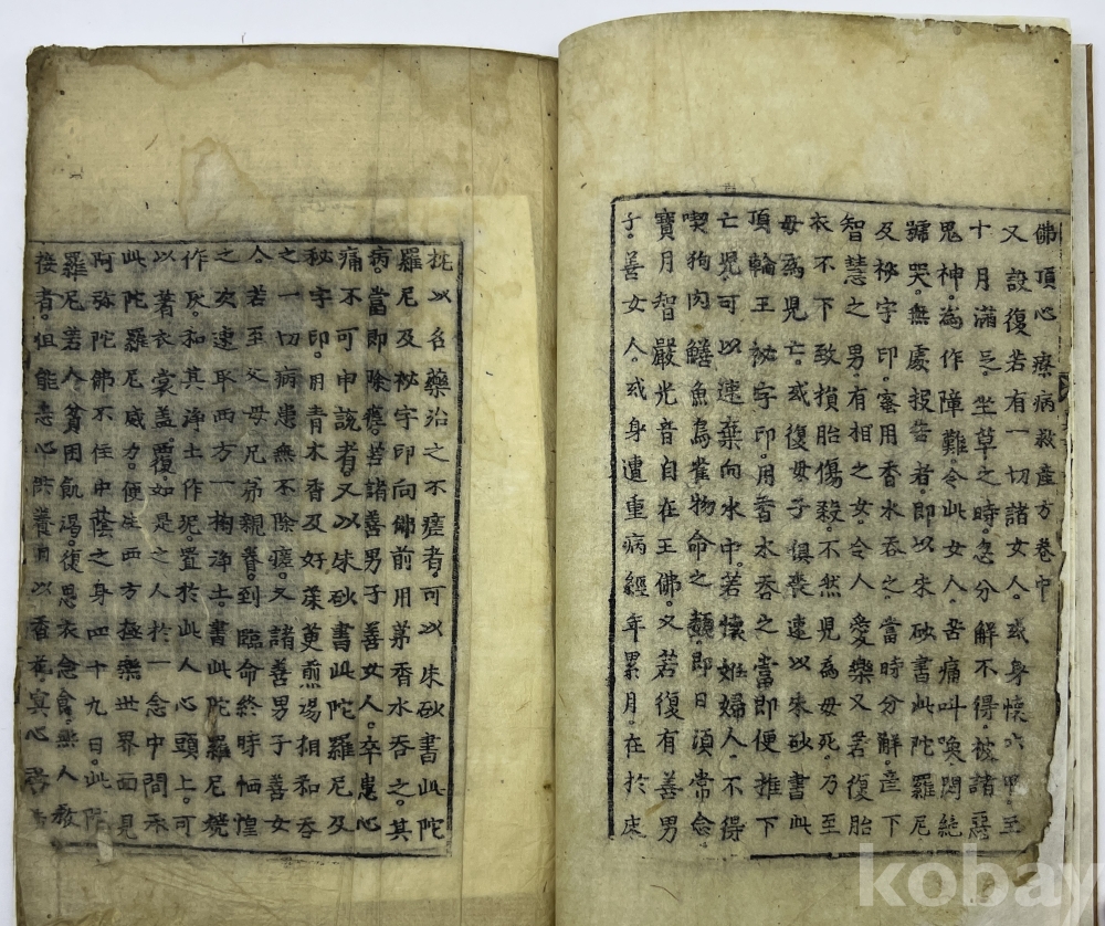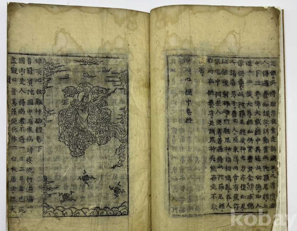 설 명 | 불정심다라니경(佛頂心陀羅尼經) 상중하 1책이다. 각 권의 제목을 ‘불정심다라니경’, ‘불정심경(佛頂心經)’, ‘불정심구난심험경(佛頂心救難神驗經)’ 등으로 표기했다. 변상도가 내지에 2곳이 보인다. 서두에 불정심관세음보살대다라니경(佛頂心觀世音菩薩大陀羅尼經)의 핵심 진언인 모다라니(母陀羅尼)의 한글 독음이 표기되었다. 약 3장 정도를 제외하고 전체를 배접 보강했다. 이전 기획전에서 153만원에 낙찰되었으나 낙찰자가 미입금하여 재경매 물품번호 103번 | |||||