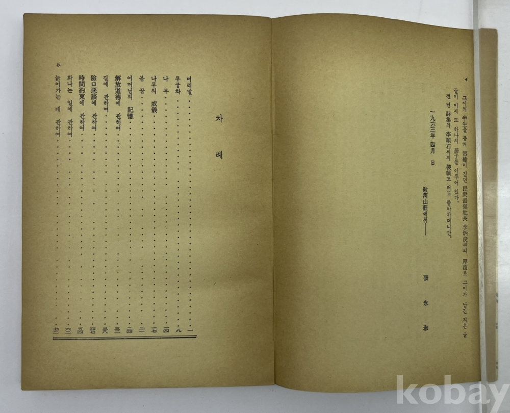 설 명 | 이양하(李敭河, 1904~1963)의 제2 수필집으로 41편이 수록되어 있다. 구김, 오염 등 있으나 전체적으로 상태가 양호하다. | |||||