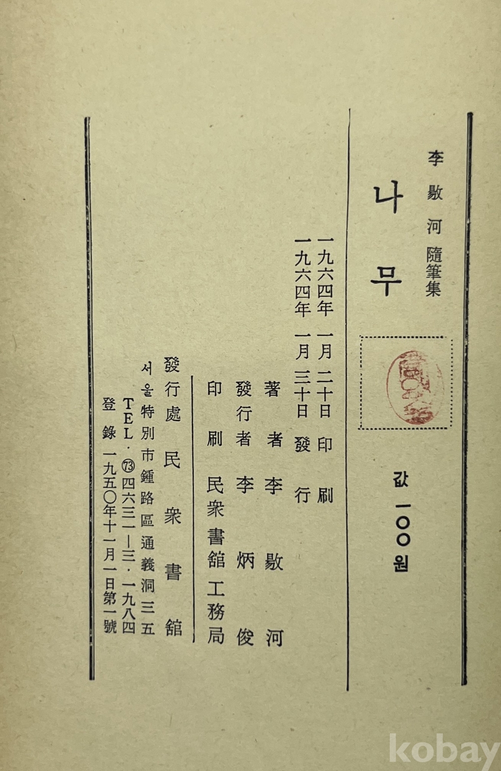 물 품 명 | <신춘문예(新春文藝)> 1964년 민중서관(民衆書館) 발행 이양하(李敭河) 제2 수필집 [나무] 1책 | |||||