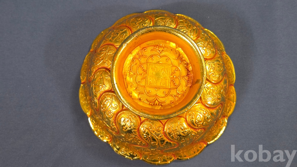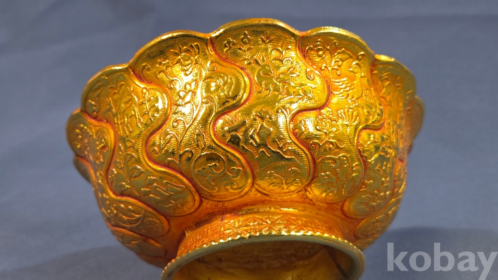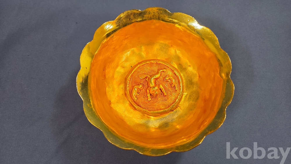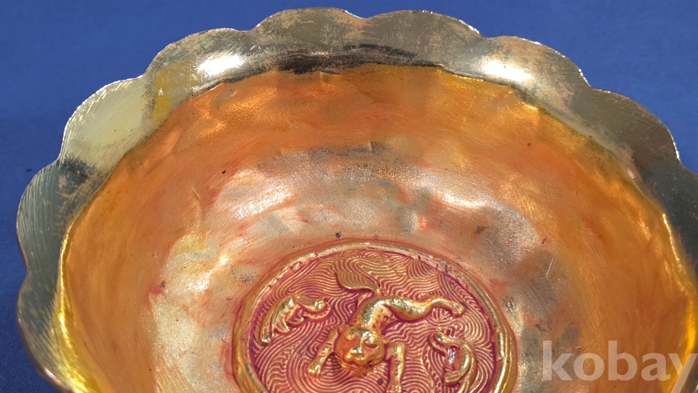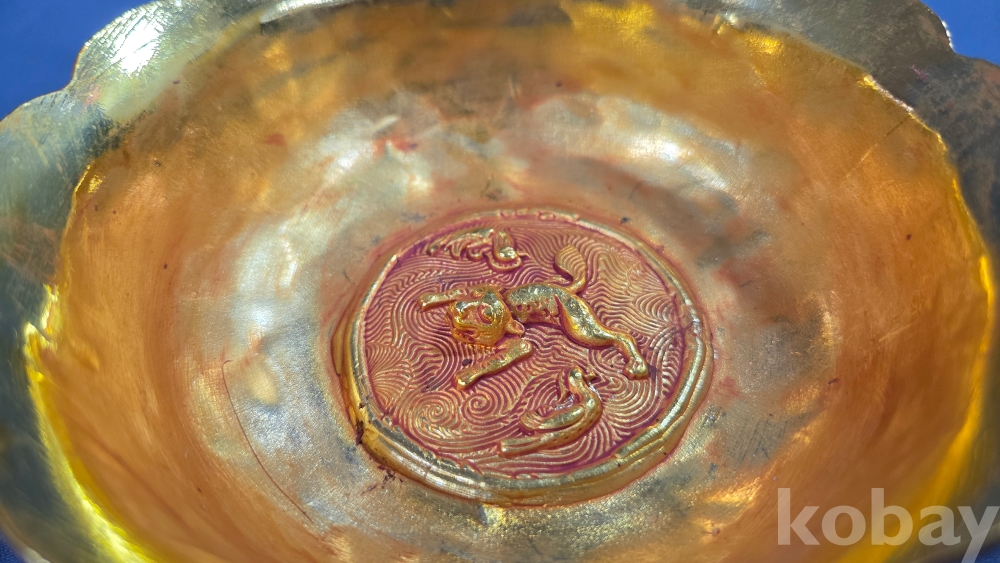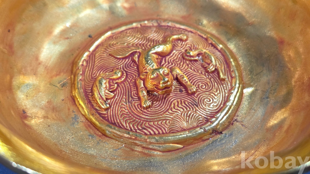 내부에 고대동물이 부조상으로 들어있는 금동 다완입니다.