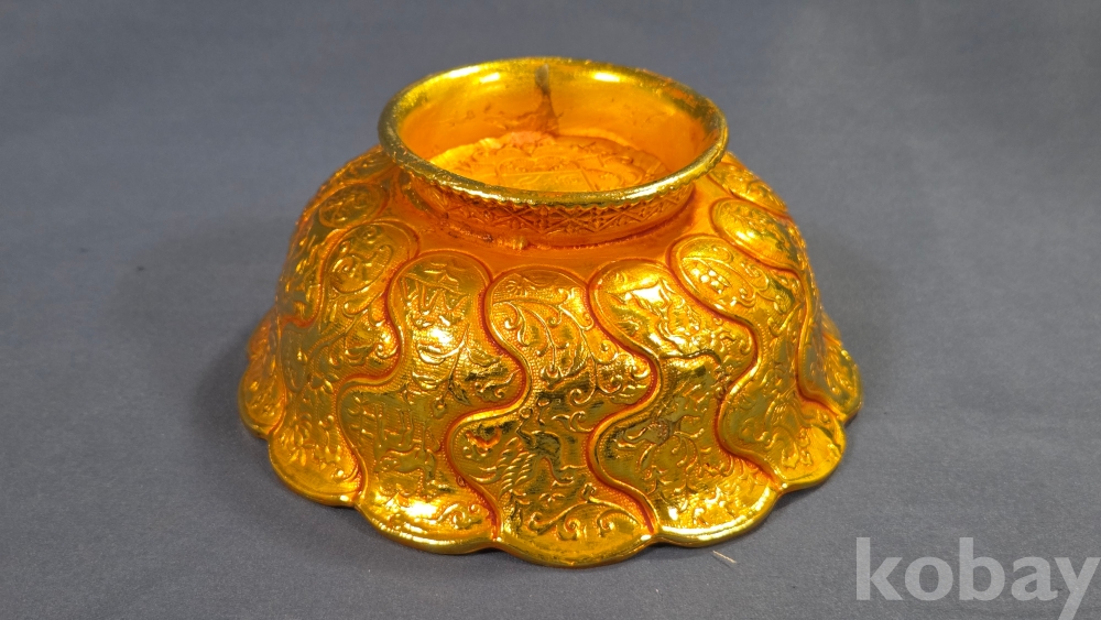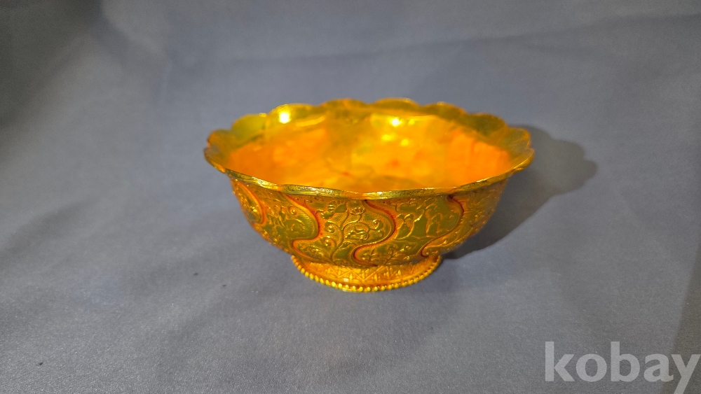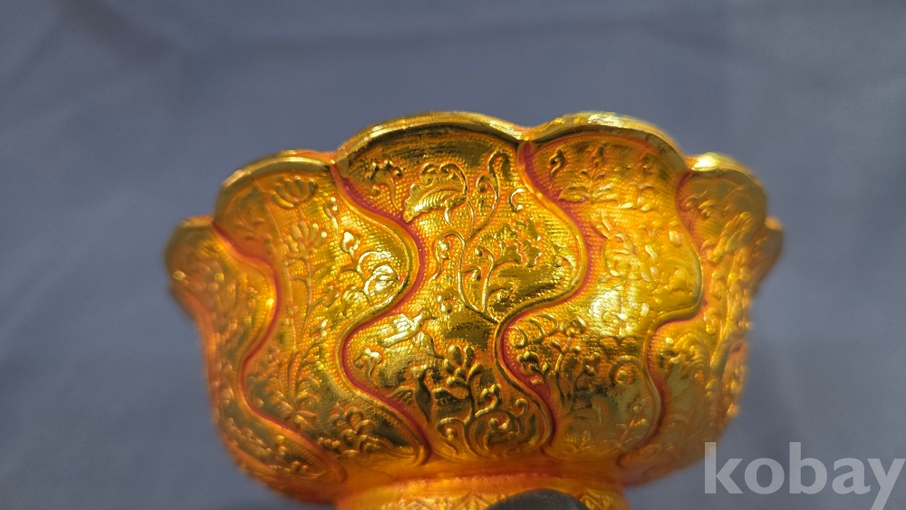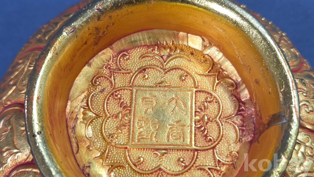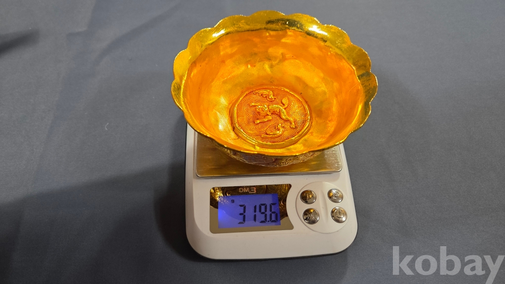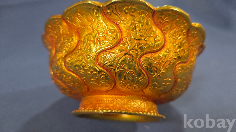 내부에 고대동물이 부조상으로 들어있는 금동 다완입니다.