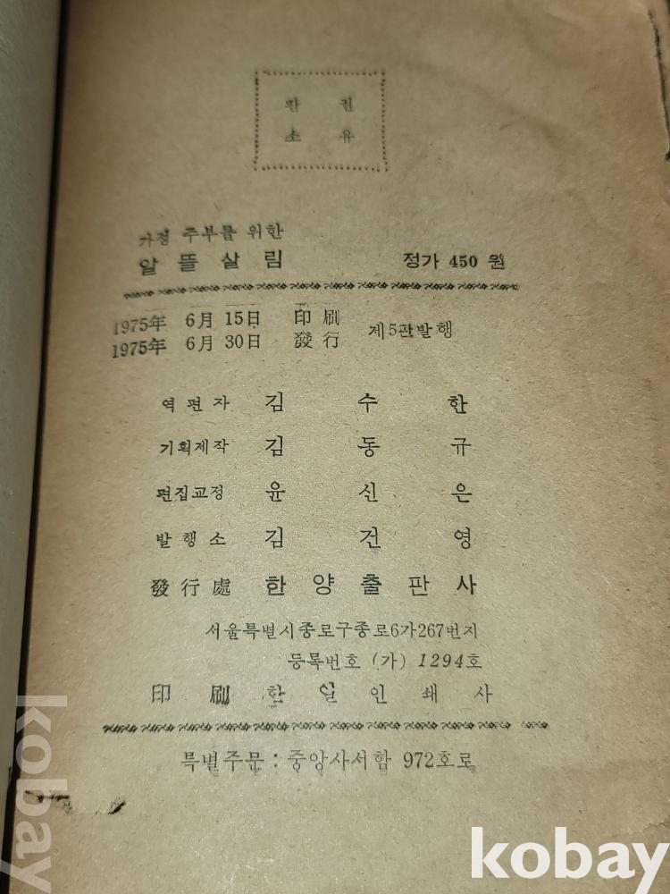 빈티지 세월 감이 느껴지는 1975년 한양출판사 발행 세월감이 느껴지는 가정 주부를 위한 알뜰살림 고서적입니다.