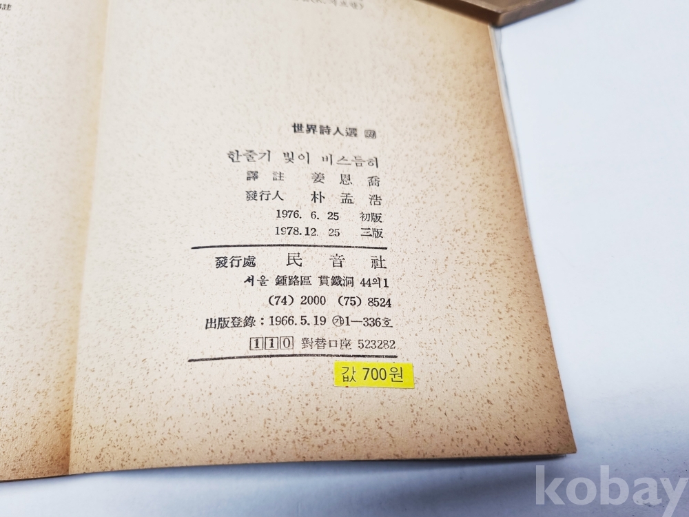 [묻지마 천원 경매] YBK20 민음사 한줄기 빛이 비스듬히 에밀리 디킨슨 1978