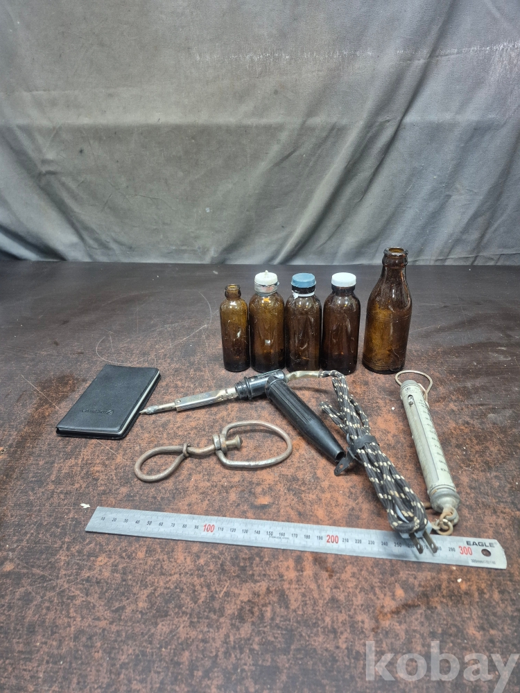 1960년대 동아제약 갈색병 5점 1970년대 매달아쓰는 저울 1점 국산 인두기 110볼트 1점 계산기1 대장간에서 만들 걸이 1점 일괄 5*5*16