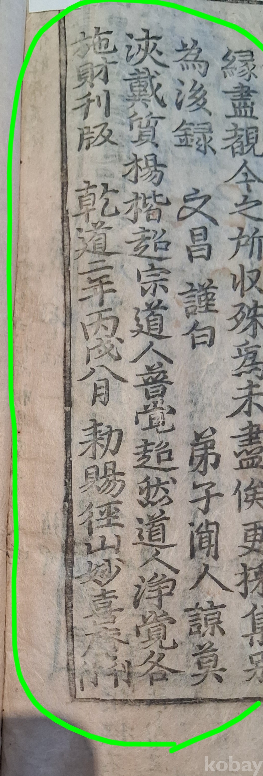 乾道 二年 丙戌 八月 勅賜 徑山 妙喜庵 刊 건도 이년 병술 팔월 칙사 경산 묘희암 간