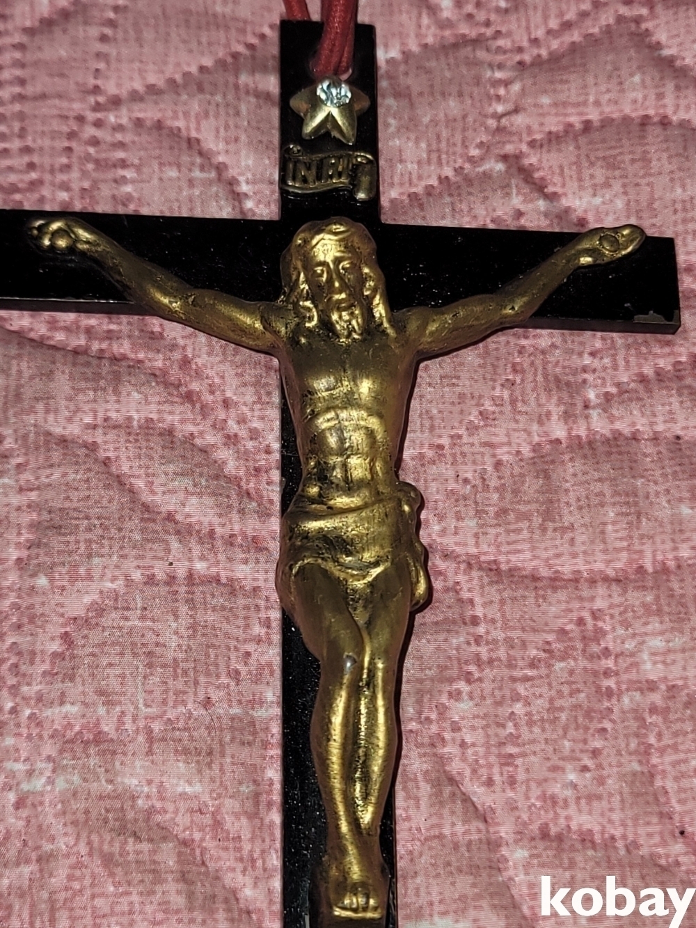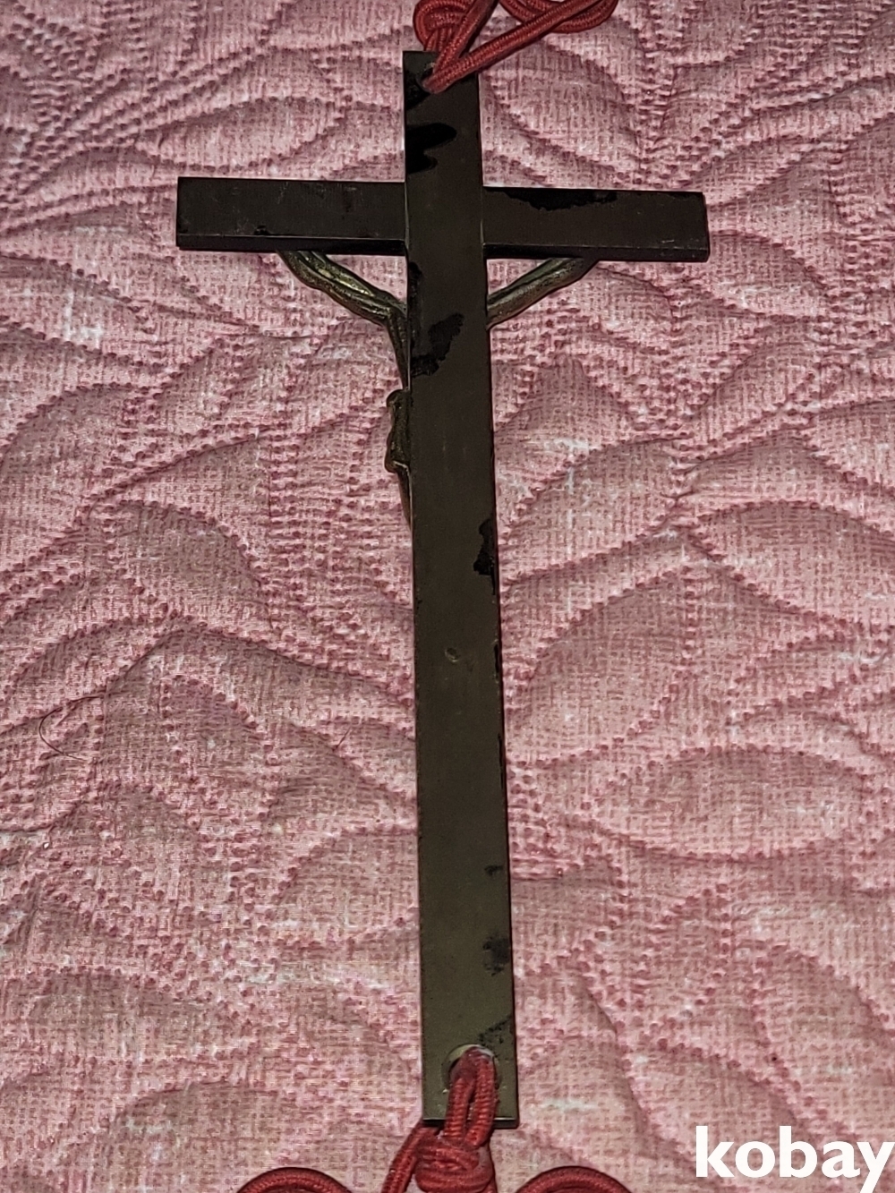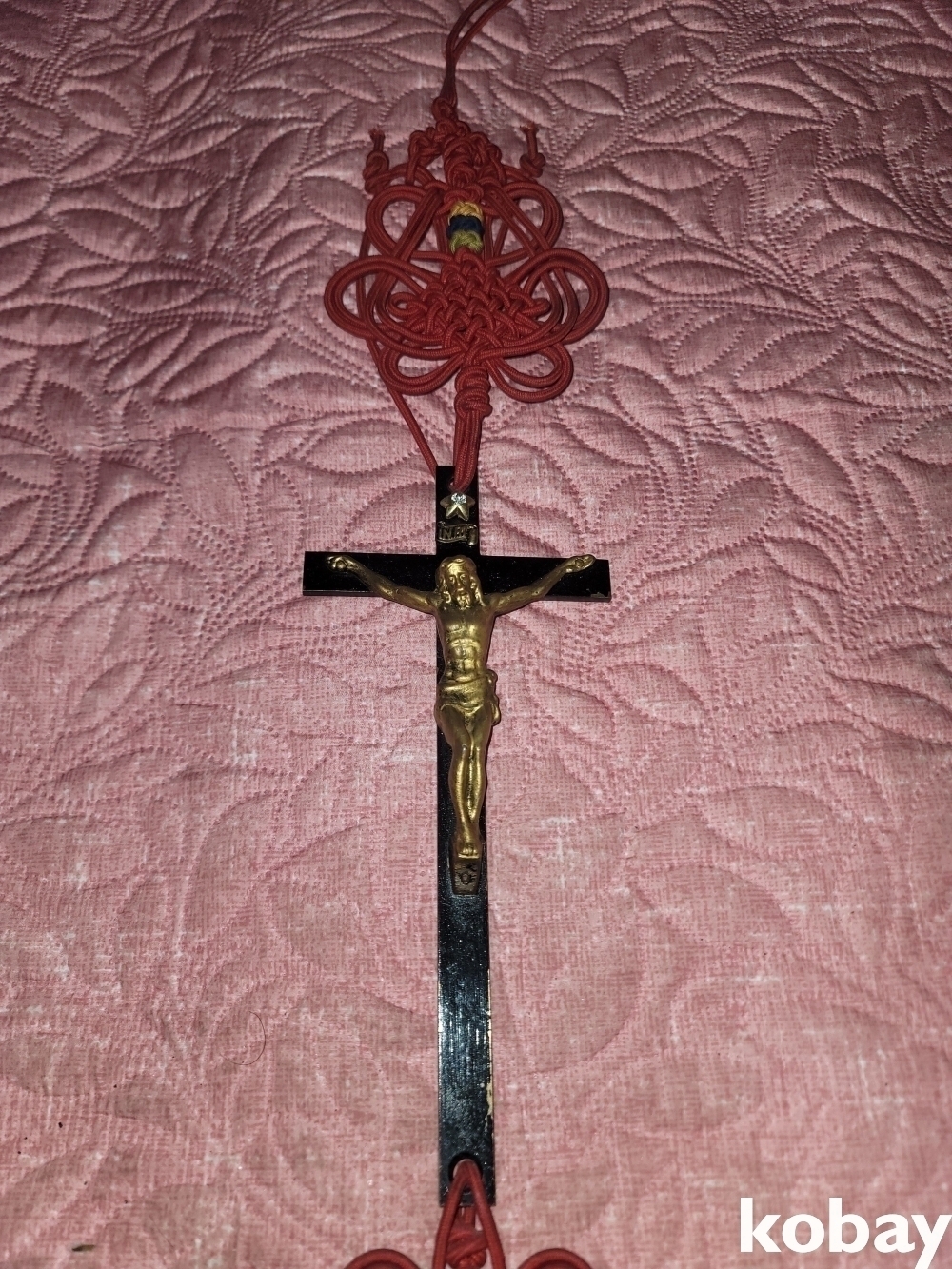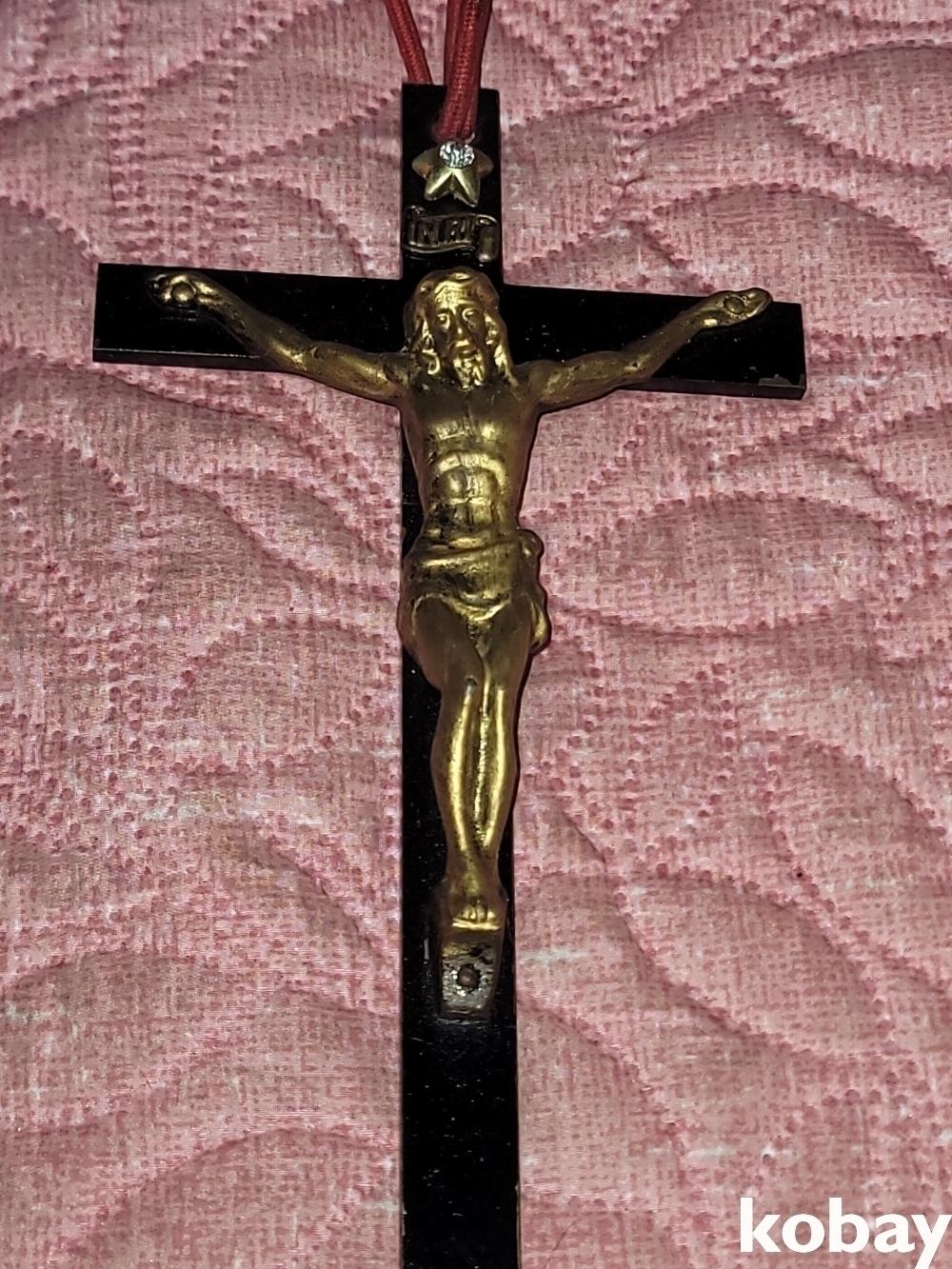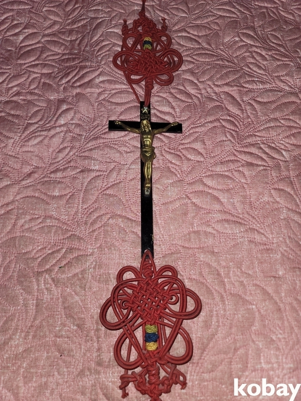 빈티지 세월 감이 느껴지는 빈티지 옛날 전통 리본 예수 십자가 동 장식입니다.