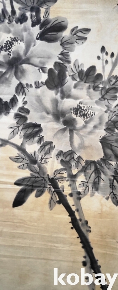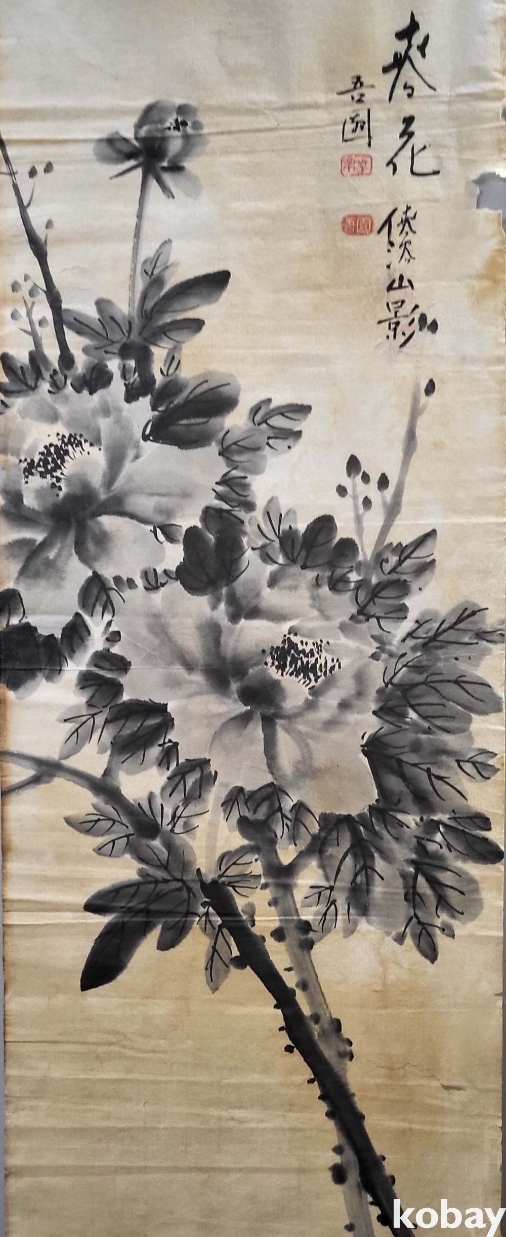 吾園 承業(오원 승업) 수결이 보이는 종이에 수묵(水墨) 으로 채색된 목단그림입니다,