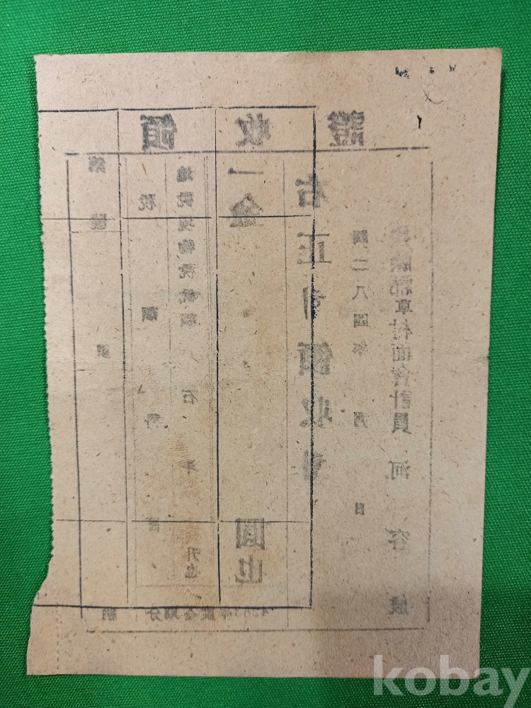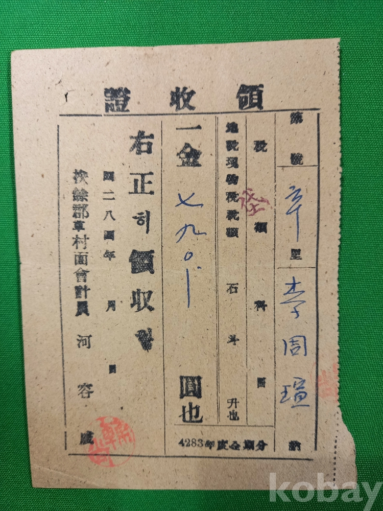 당시 세금을 현물(곡물)이나 그에 상응하는 화폐로 납부했음을 증명하는 역사적 사료입니다. 1950년대 초반 지방 행정 체계와 조세 제도를 보여주는 자료입니다.