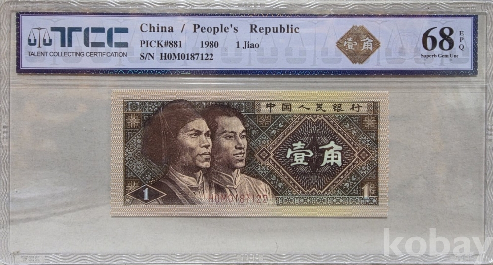 -1980년 중국 인민은행 발행 1각 지폐 TCC68 고등급 입니다.