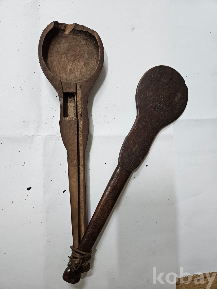 왼쪽 부재: 길쭉한 손잡이 부분과 넓은 원형의 머리 부분으로 구성되어 있으며, 안쪽이 깊게 파여 저울의 주요 부품(저울대, 추 등)을 안전하게 수납하도록 제작된 것으로 보입니다. 머리 부분의 파손 흔적은 세월의 흐름을 보여줍니다.