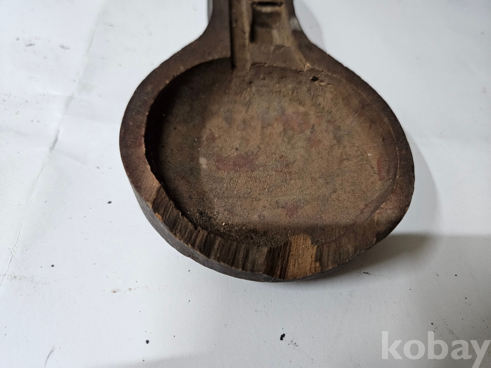 사진 속 물건은 **전통적인 약 저울(막대 저울)**을 보관하거나 휴대할 때 사용되던 목재 케이스의 일부로 강력히 추정됩니다. 일반적으로 약 저울은 저울대, 저울추, 약 접시 등을 정교하게 보관할 수 있도록 안쪽이 파인 목재 케이스에 담겨 보관되었습니다.