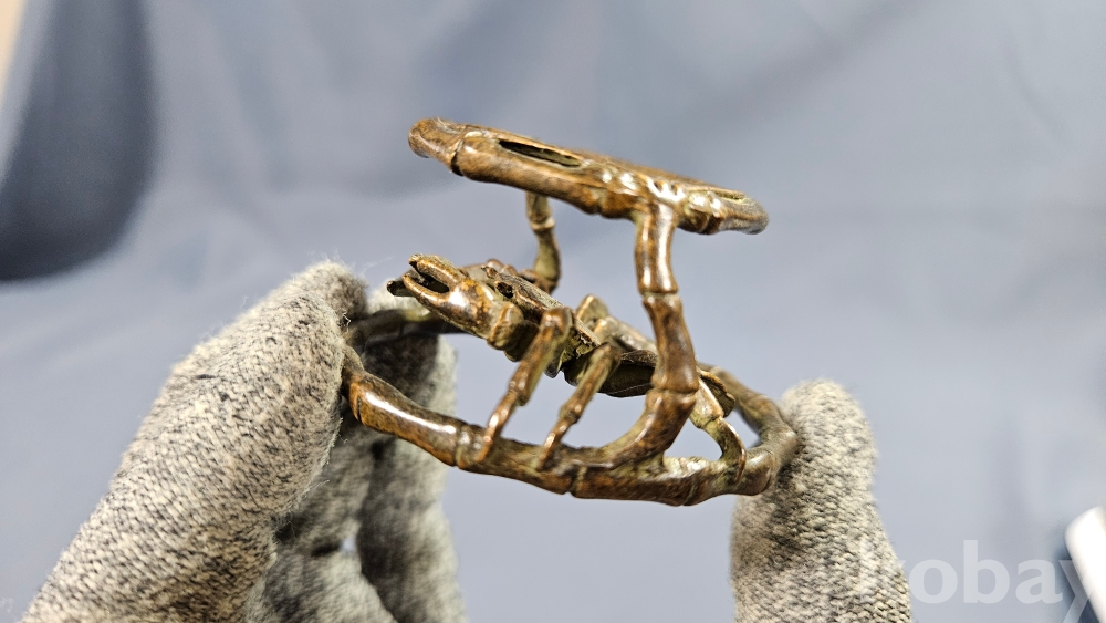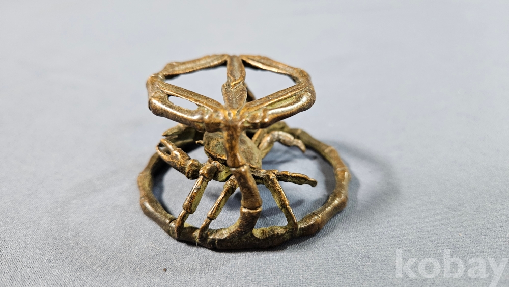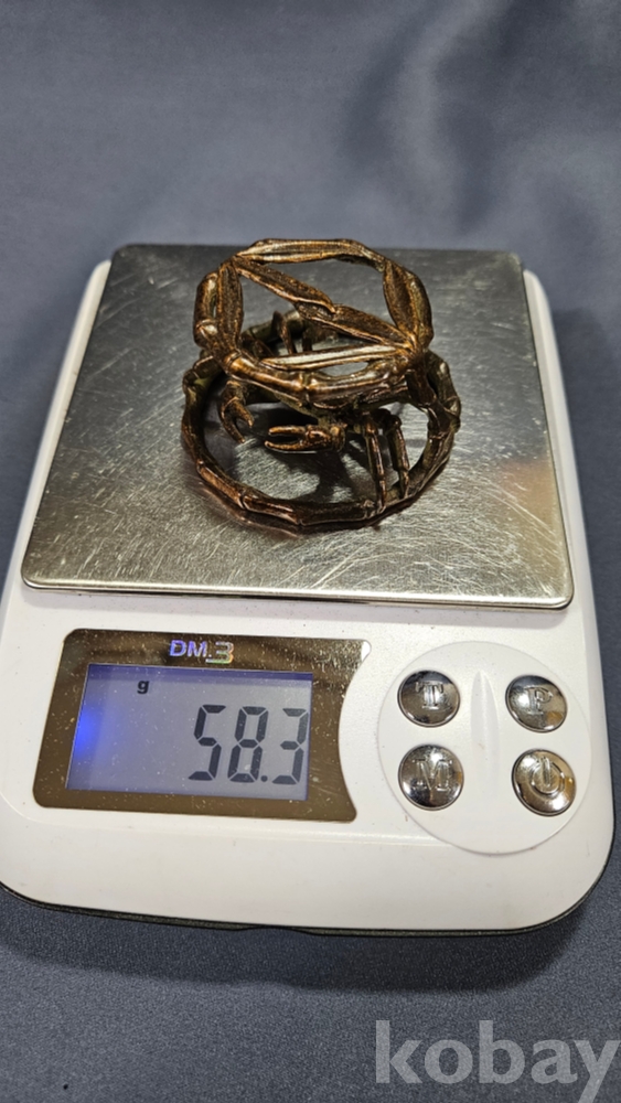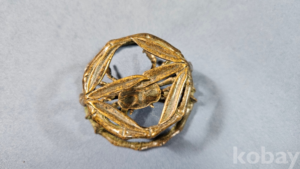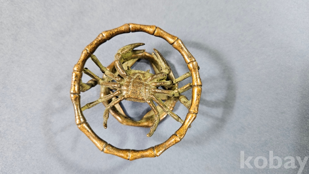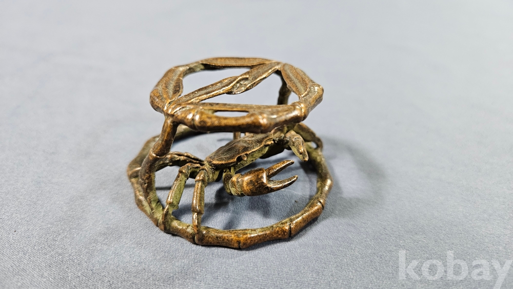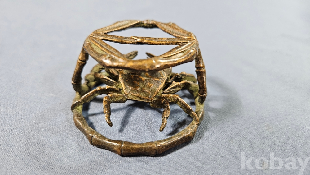 대나무 바구니형태 안에 게가 들어가있는 모습의 동제품 입니다.