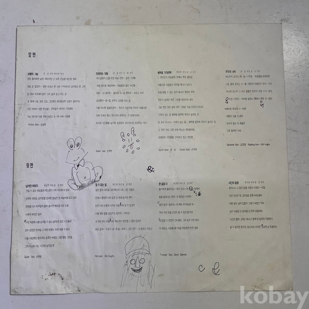 | 자켓상태 | EX : 약간의 마모, 모서리 찢김 존재 | 음반상태 | P : 깨지거나 뒤틀림, 구간 반복 발생 | 발매정보 | 알수없음 | 가사지여부 | 유 |