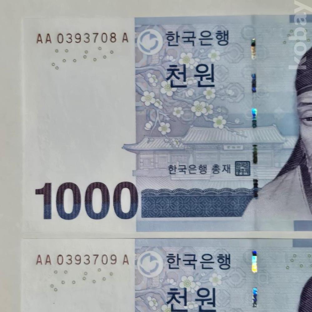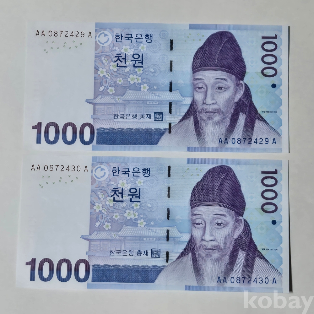 빠른번호 초판 AAA 08포인트 1000원권 연번호 2매 일괄 == 관봉에서 해체한 완전미사용 2매 일괄